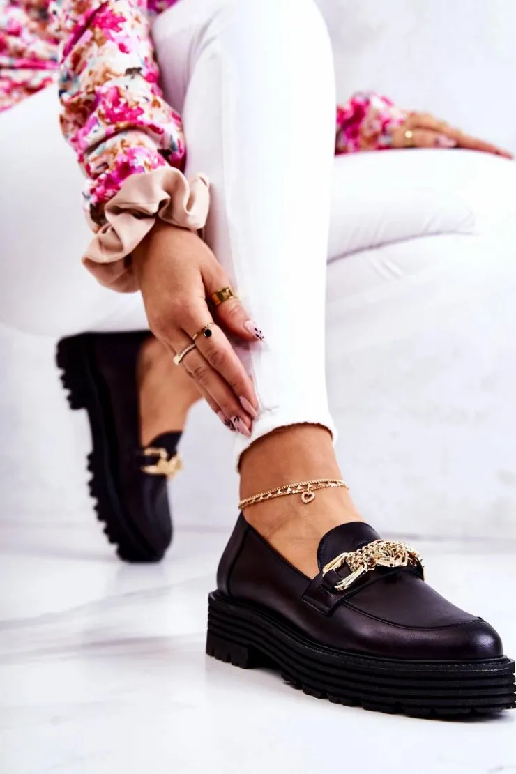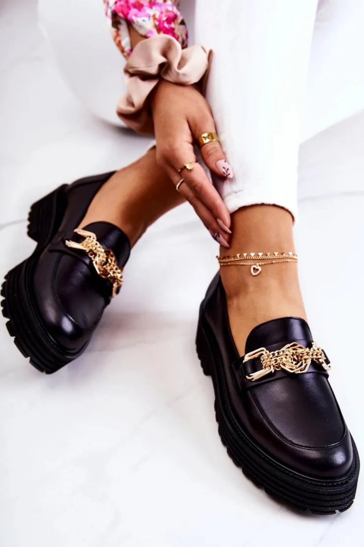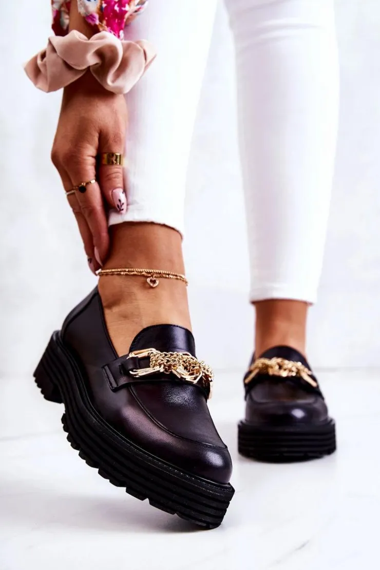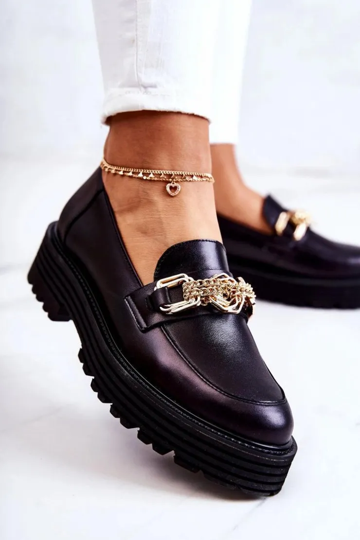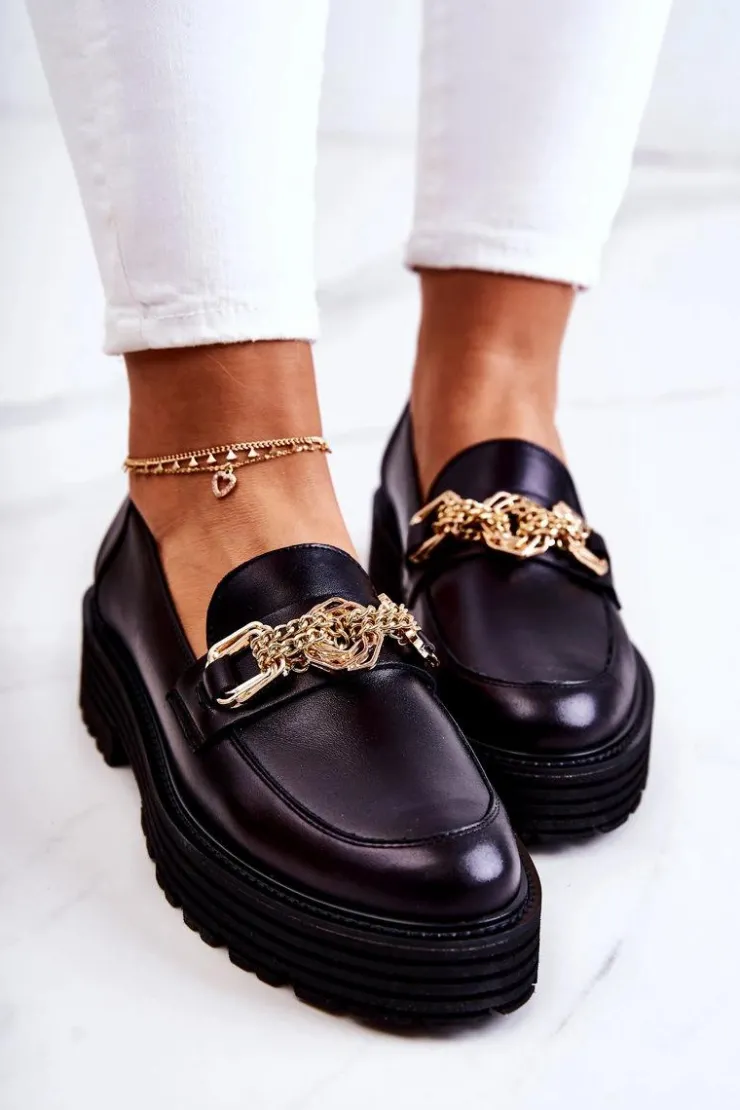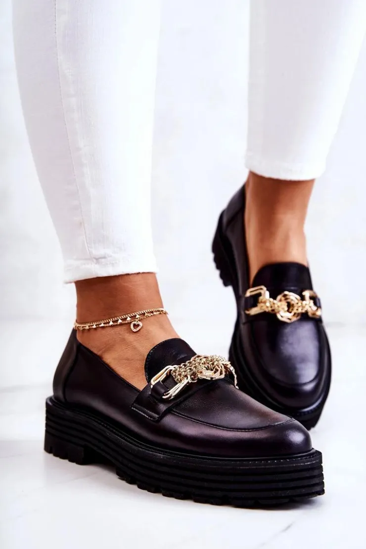 Klasyczne półbuty w stylu przepięknych loaferów! Buty zostały wykonane z wysokiej jakości skóry naturalnej. Charakterystyczne zdobienie w postaci łańcucha sprawi, że stworzymy z nimi wiele wspaniałych stylizacji. Posiadają wysoką podeszwę obszytą nicią oraz płaski obcas, który uniesie sylwetkę. Świetny model do wielu stylizacji! Wygodne, a zarazem modne. Koniecznie musisz je mieć! Przy wyborze rozmiaru prosimy sugerować się tabelą rozmiarów.