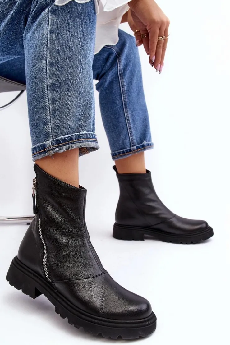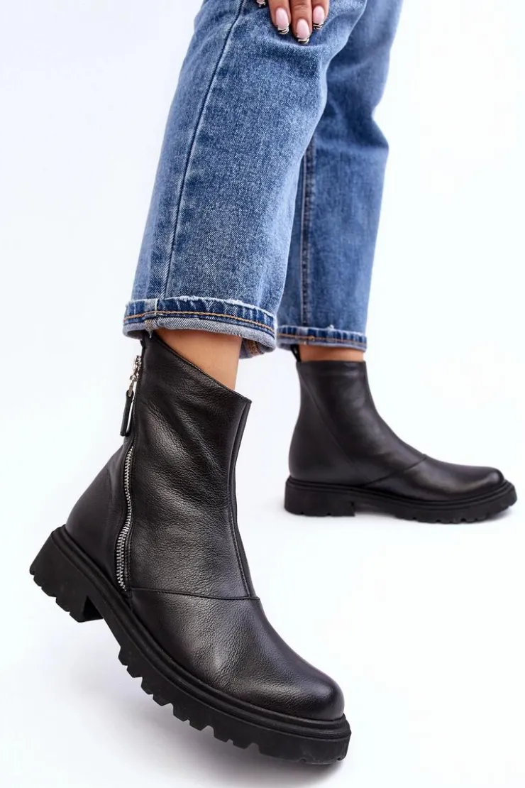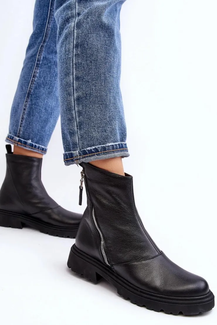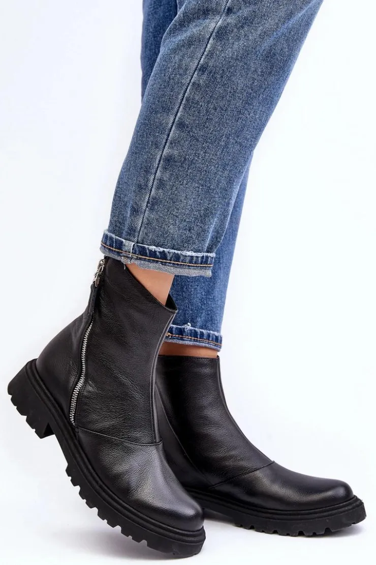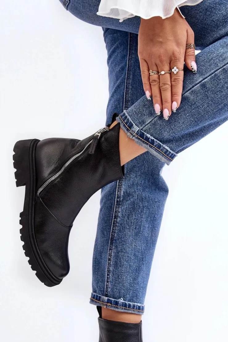 Damskie botki wykonane ze skóry naturalnej. Posiadają zamek z boku cholewki. Osadzone na płaskim obcasie ze żłobieniami. Środek ocieplony kocem obuwniczym. Noski zaokrąglone. Usztywniony zapiętek. Świetny model do wielu stylizacji! Musisz je mieć! Przy wyborze rozmiaru prosimy sugerować się tabelą rozmiarów.