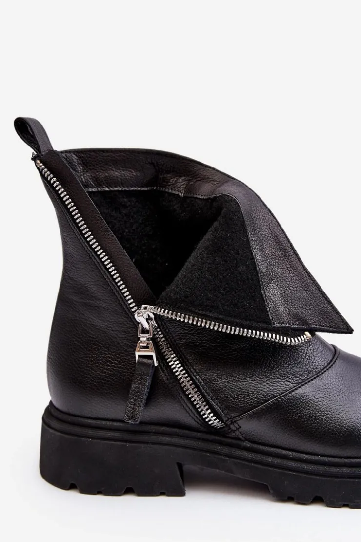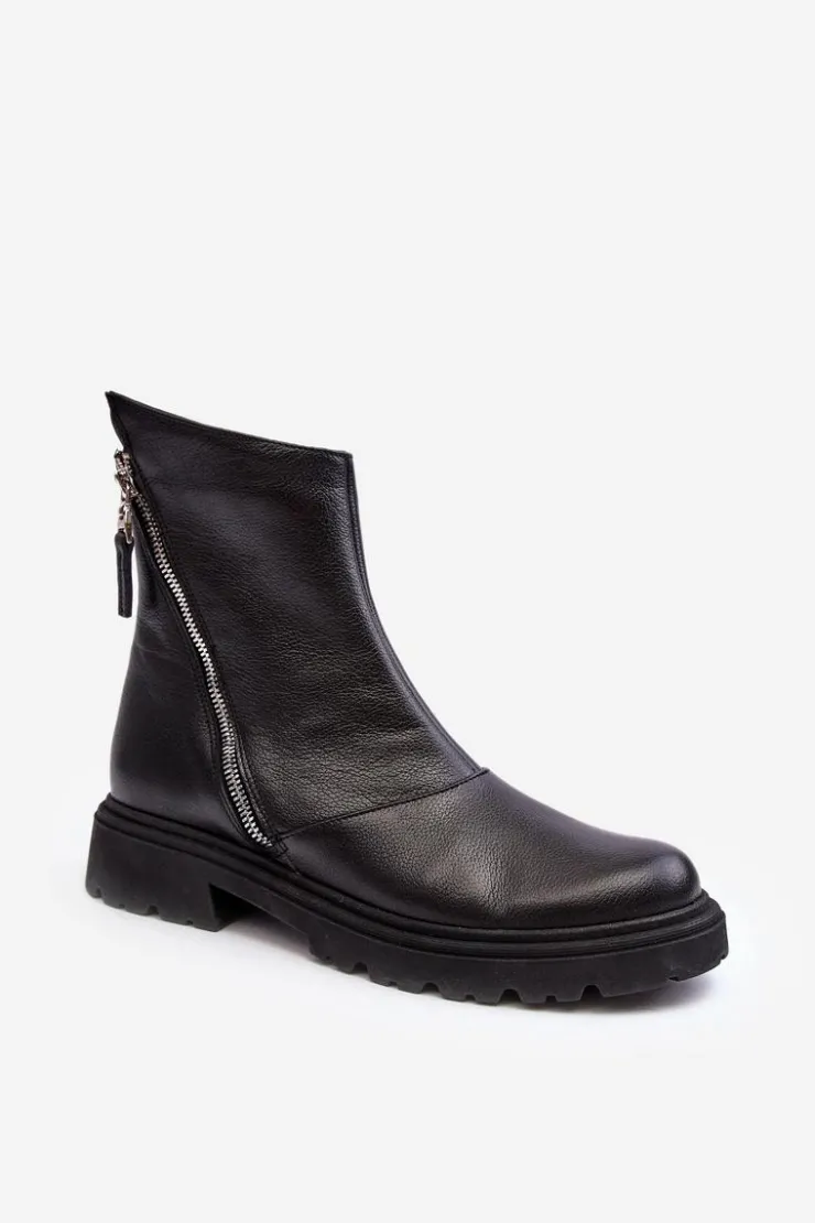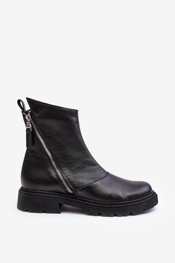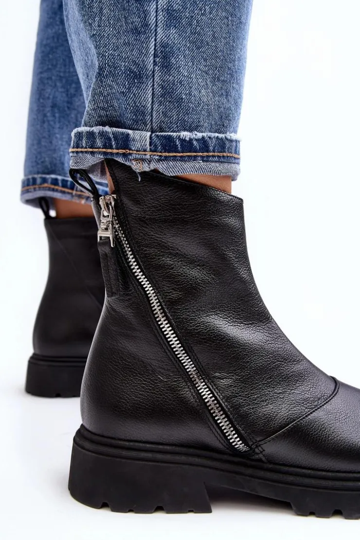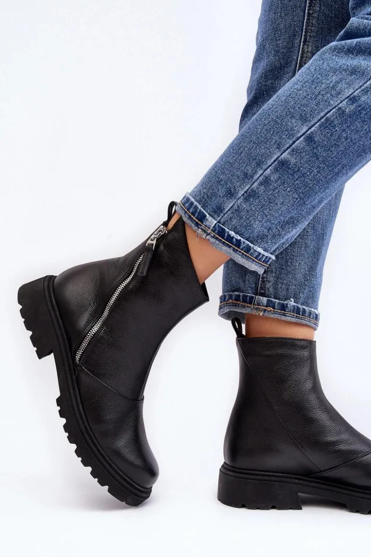 Damskie botki wykonane ze skóry naturalnej. Posiadają zamek z boku cholewki. Osadzone na płaskim obcasie ze żłobieniami. Środek ocieplony kocem obuwniczym. Noski zaokrąglone. Usztywniony zapiętek. Świetny model do wielu stylizacji! Musisz je mieć! Przy wyborze rozmiaru prosimy sugerować się tabelą rozmiarów.