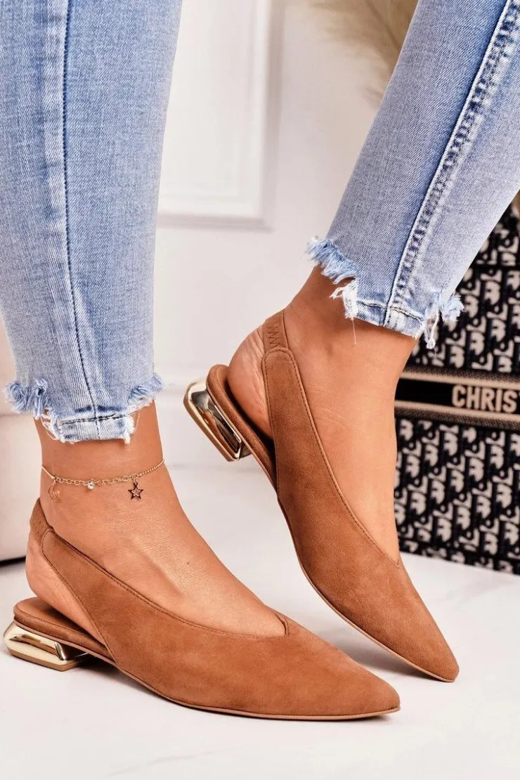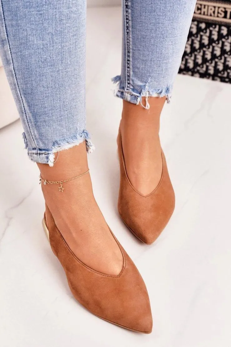 Damskie Laura Messi Zamszowe Baleriny Na Złotym Obcasie 2127 Camel