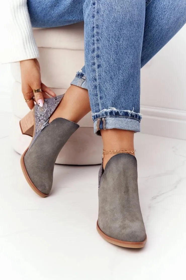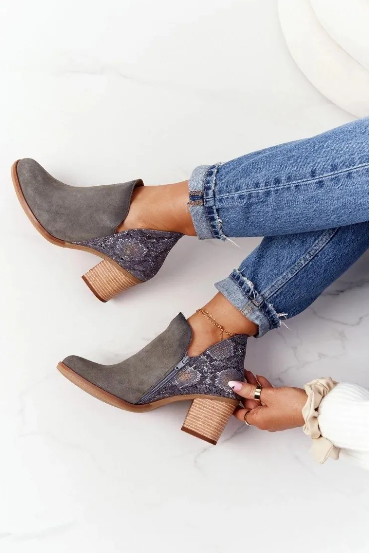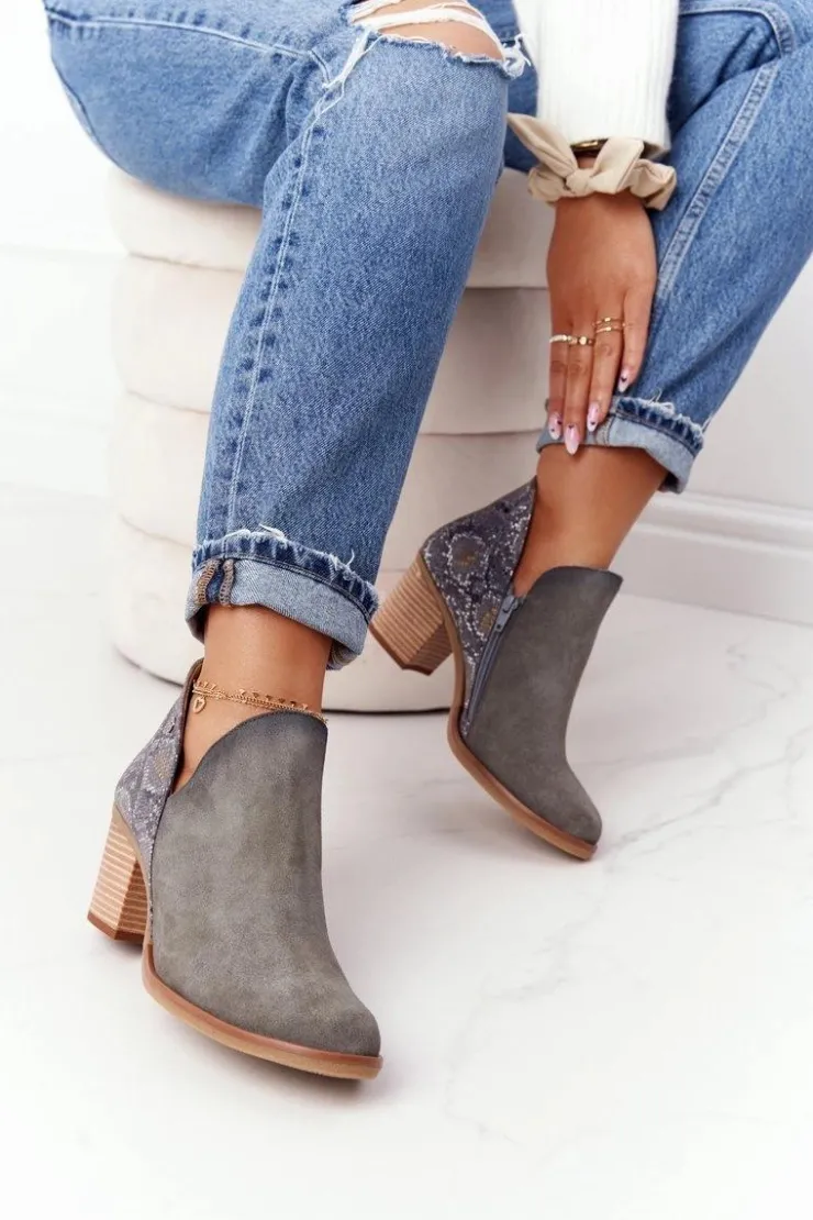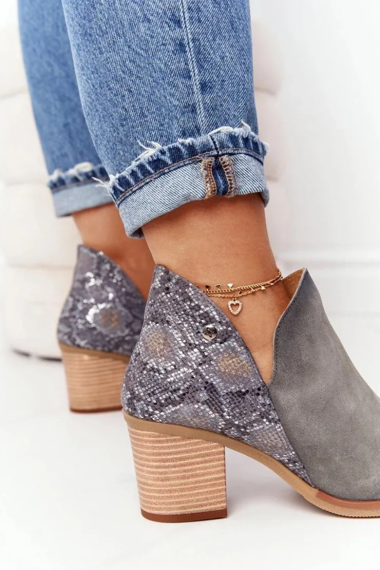 Damskie Maciejka Damskie Skórzane Botki Na Słupku Popielate 04492