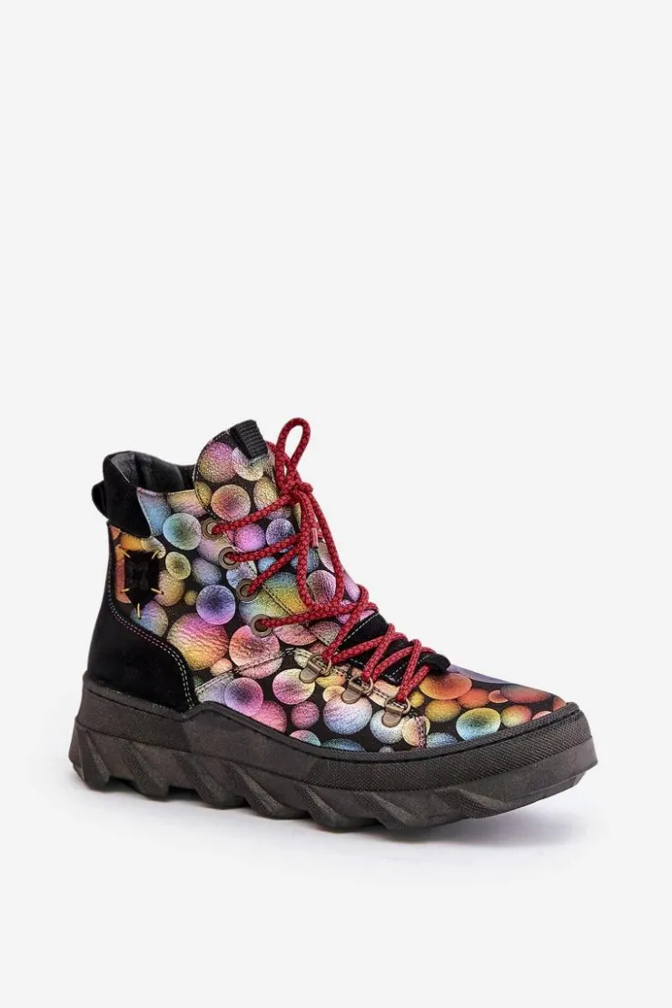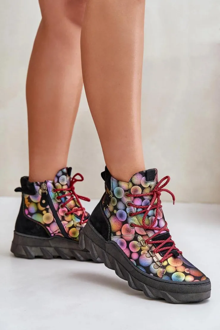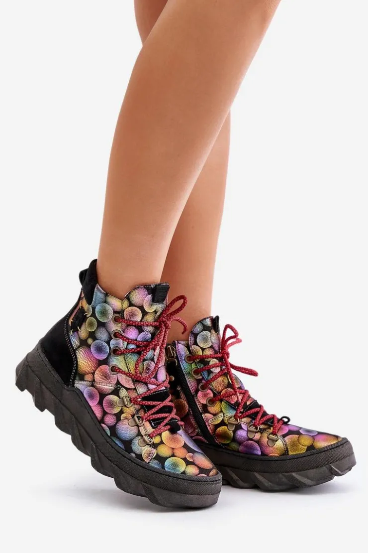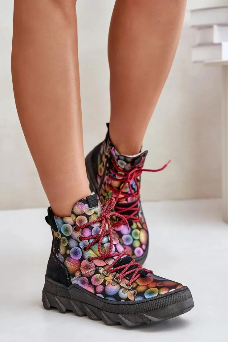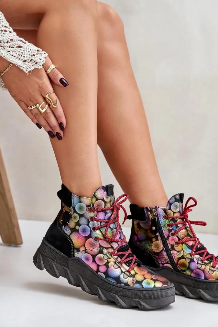 Botki damskie marki Maciejka wykonane są z najwyższej jakości skóry naturalnej. Osadzone na platformie. Z przodu sznurowanie. Model ten zapinany jest na suwak z boku cholewki. Wewnątrz ocieplone kożuchem. Noski zaokrąglone. Usztywniony zapiętek. Przy wyborze rozmiaru prosimy sugerować się tabelą rozmiarów.