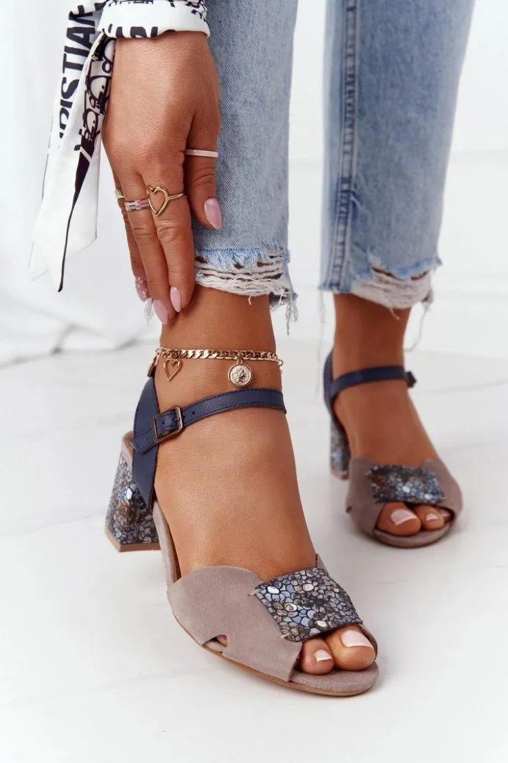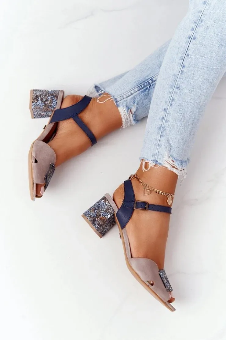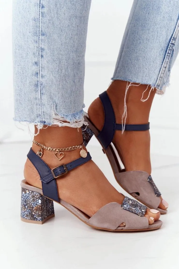 Damskie Maciejka Skórzane Sandały Na Obcasie 04120-43 Beżowo-Granatowe