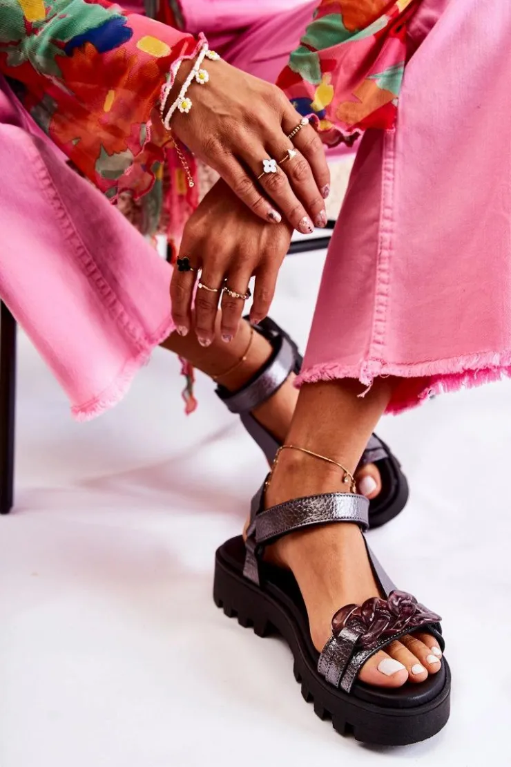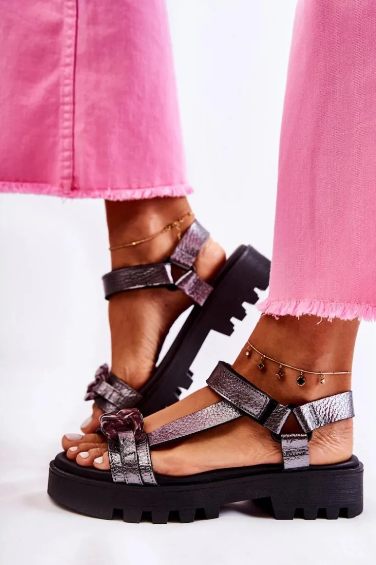 Sandały damskie od marki Maciejka to wyjątkowy model, który powinnaś mieć! Osadzone na delikatnej platformie oraz płaskim obcasie ze żłobieniem. Paseczki są wykonane z naturalnej skóry. Dodatkowo buty przyozdobione są łańcuszkiem z tworzywa sztucznego. Miękka i wygodna wkładka wykonana jest z naturalnej skóry. Model zapinany na rzepy pozwoli na odpowiednie dopasowanie do tęgości nogi. Koniecznie sprawdź pozostałe modele sandałek marki Maciejka! Przy wyborze rozmiaru prosimy sugerować się tabelą rozmiarów.