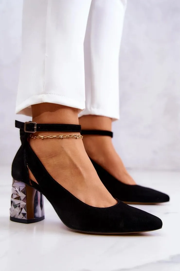 Cholewka została wykonana z przyjemnej w dotyku skóry zamszowej, dzięki której model zyskuje ponadczasowy i elegancki wygląd. Niezwykle wygodne buty na obcasie ze skórzaną wkładką. Ten model jest bardzo komfortowy w noszeniu. Unikatowa ozdoba w stylu kokardki oraz ciekawy wzór obcasa sprawią, że będziesz wyróżniać się z tłumu. Zapinane na regulowany pasek ze sprzączką. Delikatne wycięcia po bokach cholewki. Pięknie prezentują się na nodze! Przy wyborze rozmiaru prosimy sugerować się tabelą rozmiarów.
