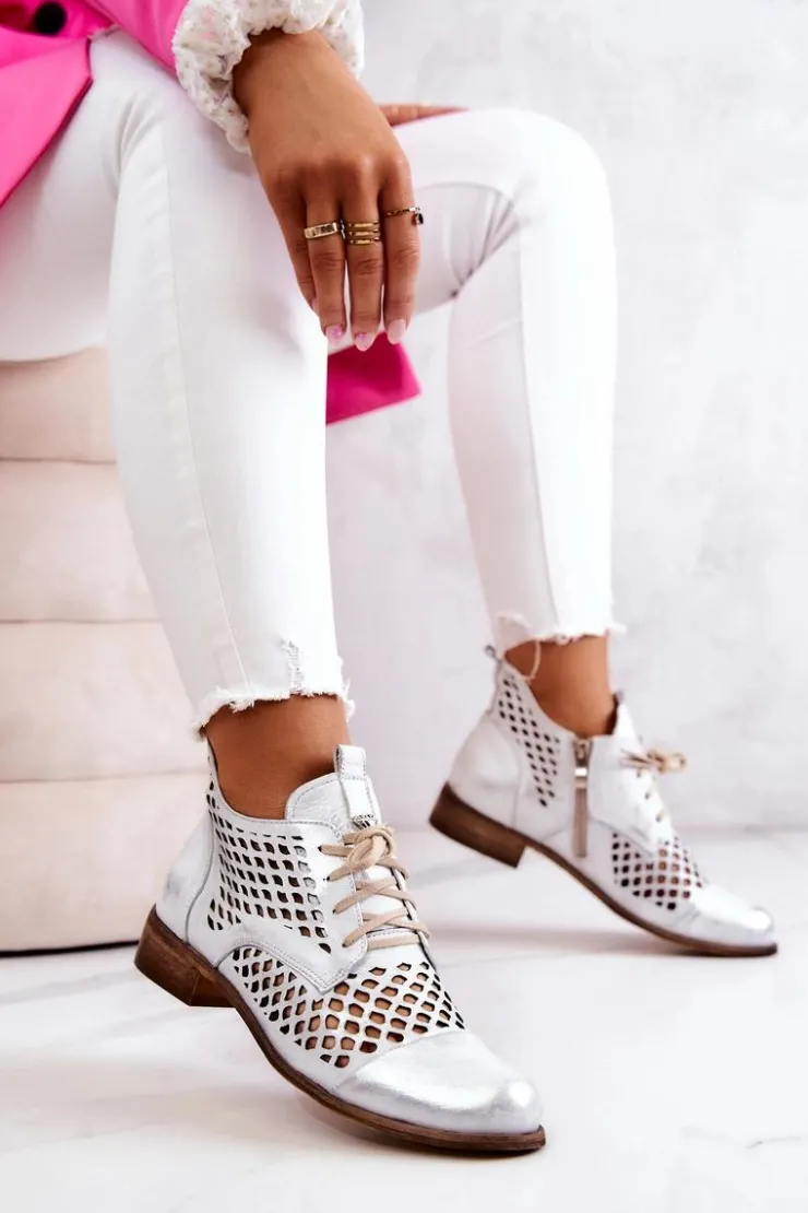 Damskie Zazoo 2704 Skórzane Ażurowe Botki Biało-Srebrne