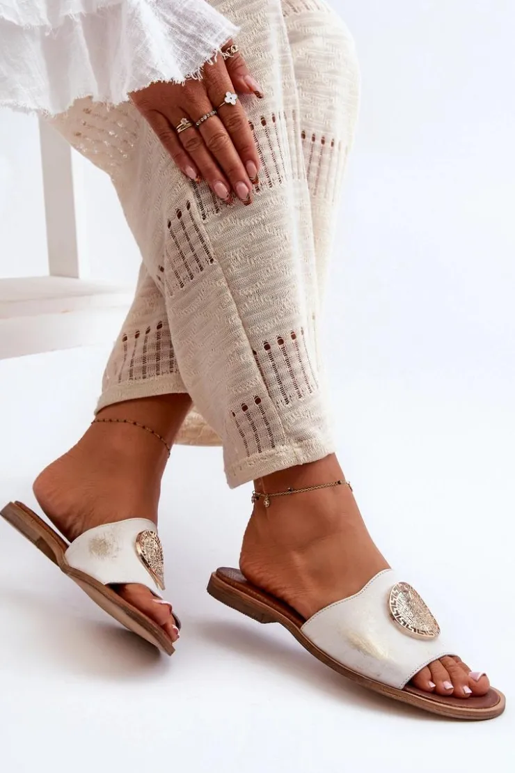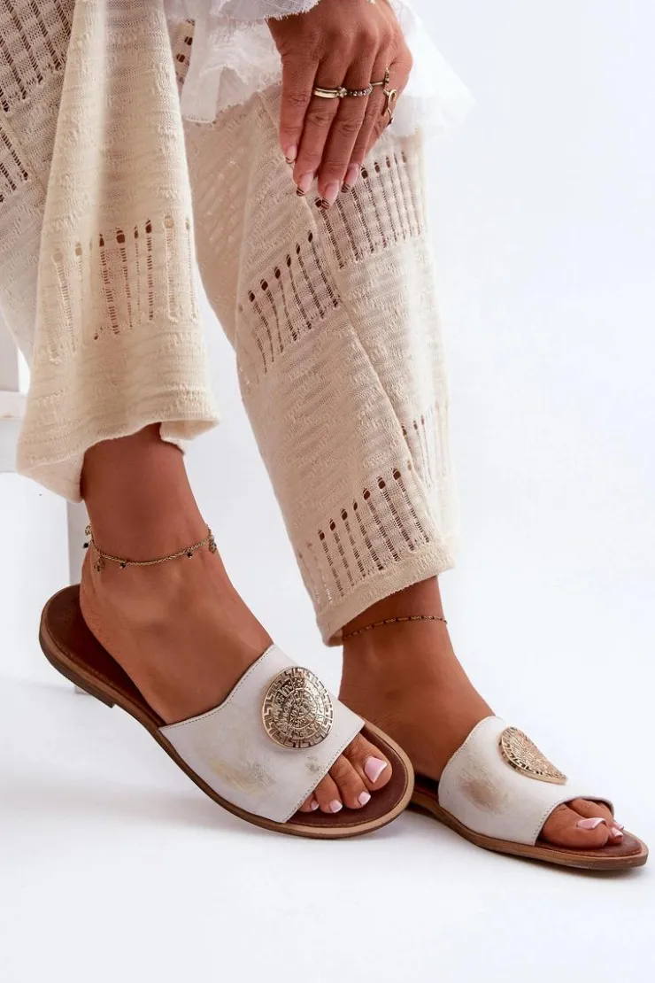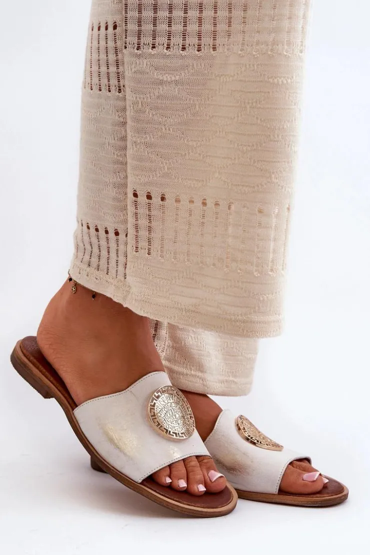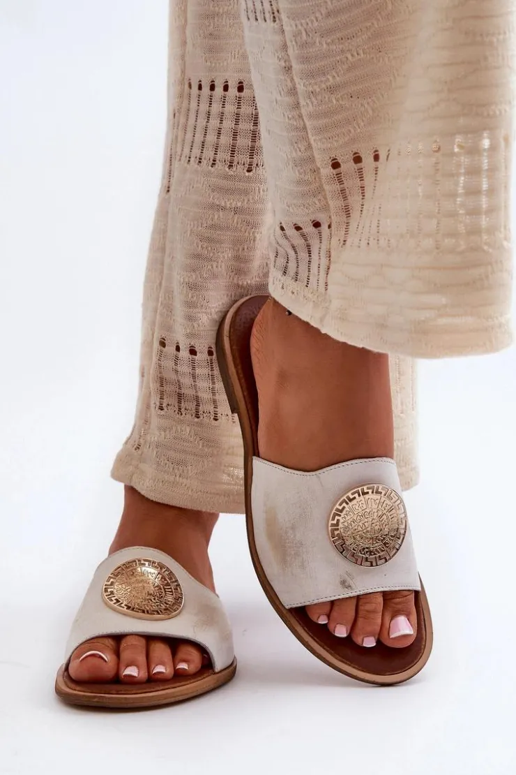 Damskie klapki wykonane ze skóry naturalnej to doskonały wybór dla kobiet, które cenią sobie elegancję i wygodę. Osadzone na płaskim obcasie, zapewniają komfort noszenia przez cały dzień, co sprawia, że są idealne zarówno do codziennych stylizacji, jak i na bardziej formalne okazje. Wzbogacone złotą ozdobą, która dodaje im wyjątkowego uroku i klasy. Dzięki starannemu wykonaniu te klapki są trwałe i stylowe, stanowiąc niezbędny element w każdej kobiecej garderobie. Przy wyborze rozmiaru prosimy sugerować się tabelą rozmiarów.
