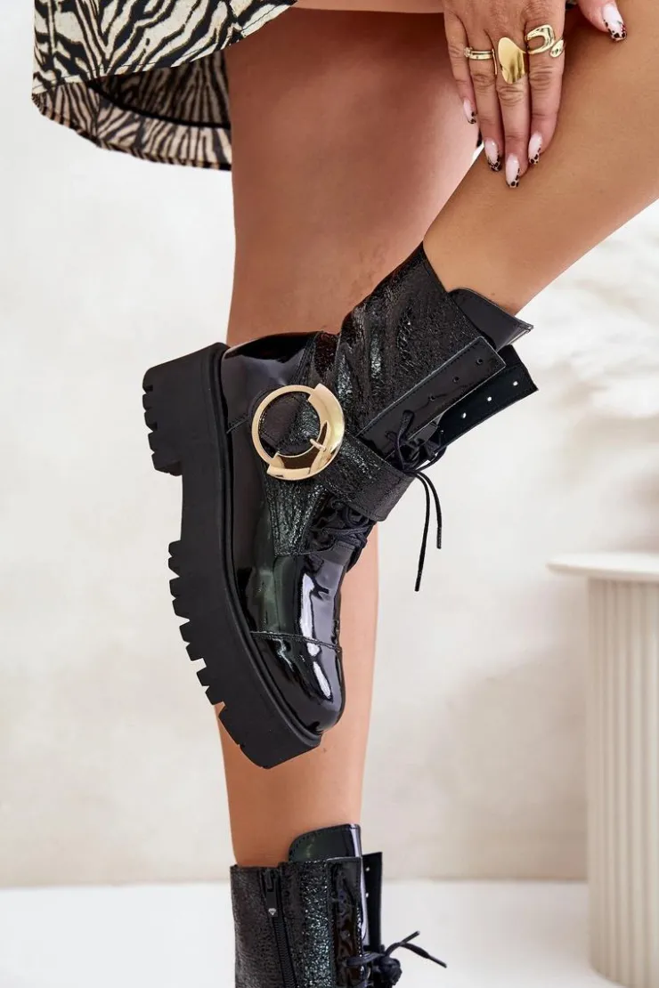 Wyjątkowe botki wykonane z naturalnej skóry. Osadzone na platformie i płaskim obcasie, zapewniają stabilność i wygodę noszenia. Model zapinany na zamek, dodatkowo posiada sznurowanie dla lepszego dopasowania. Duża klamra z paskiem na cholewce stanowi efektowny detal, który nadaje im modnego, wyrazistego charakteru. Przy wyborze rozmiaru prosimy sugerować się tabelą rozmiarów.