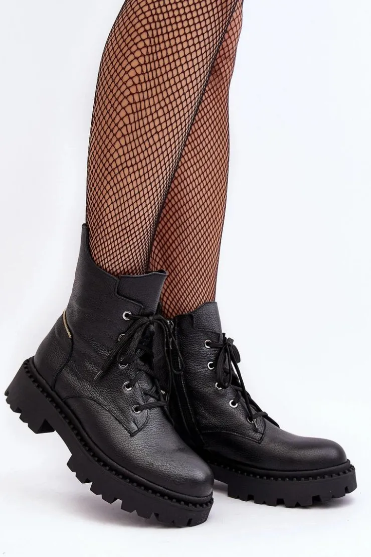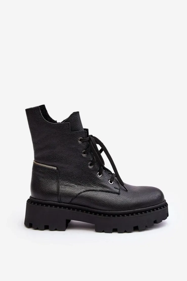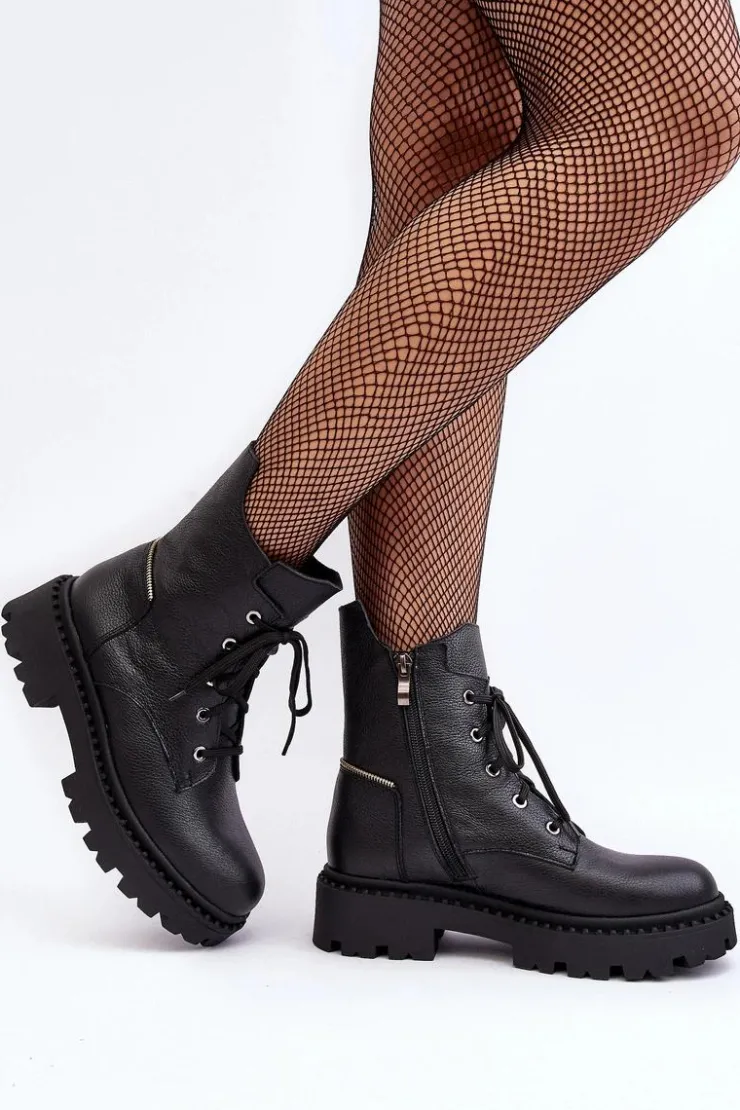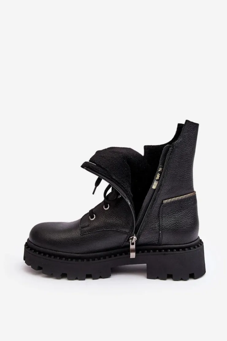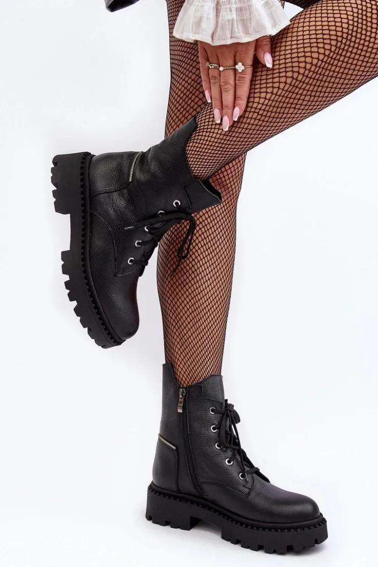Botki damskie z cholewką za kostkę. Wykonane ze skóry naturalnej. Osadzone na płaskim obcasie oraz platformie. Zapinane na suwak. Noski zaokrąglone. Usztywniony zapiętek. Środek ocieplony kocem obuwniczym. Przy wyborze rozmiaru prosimy sugerować się tabelą rozmiarów.