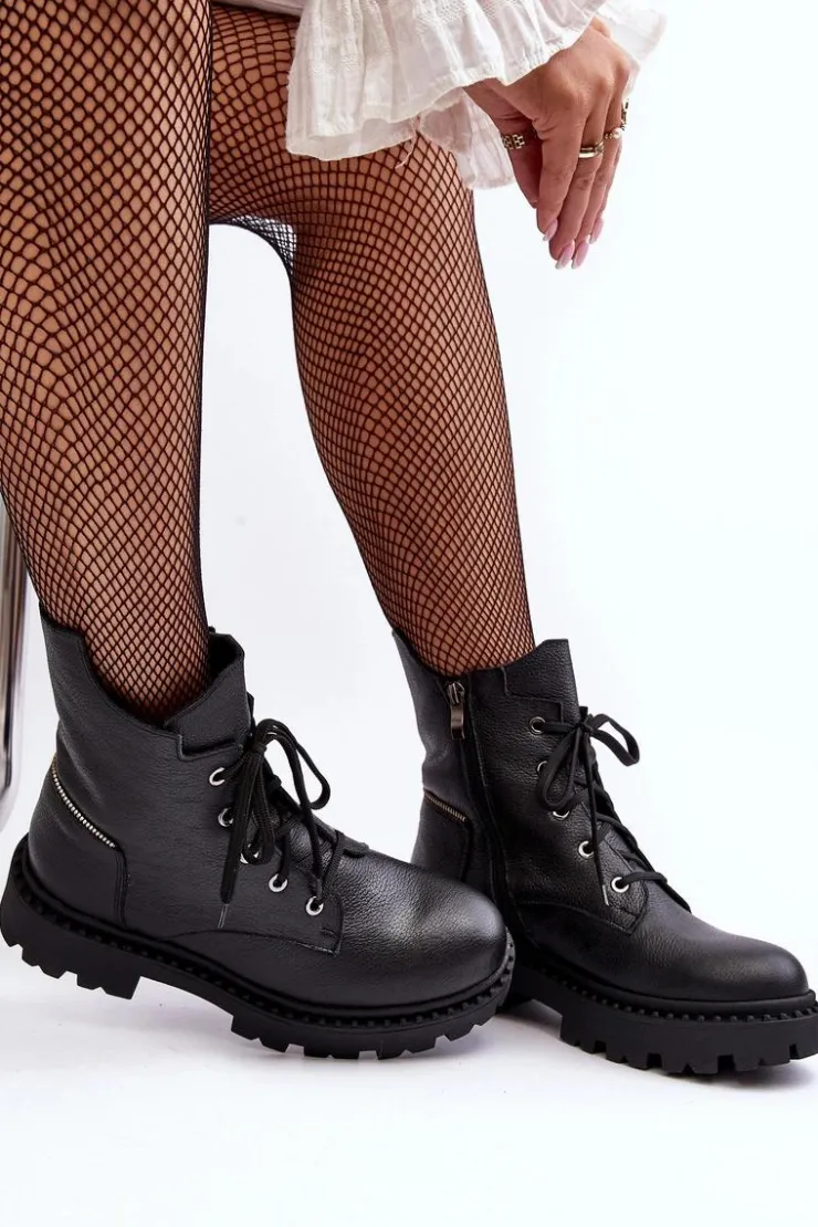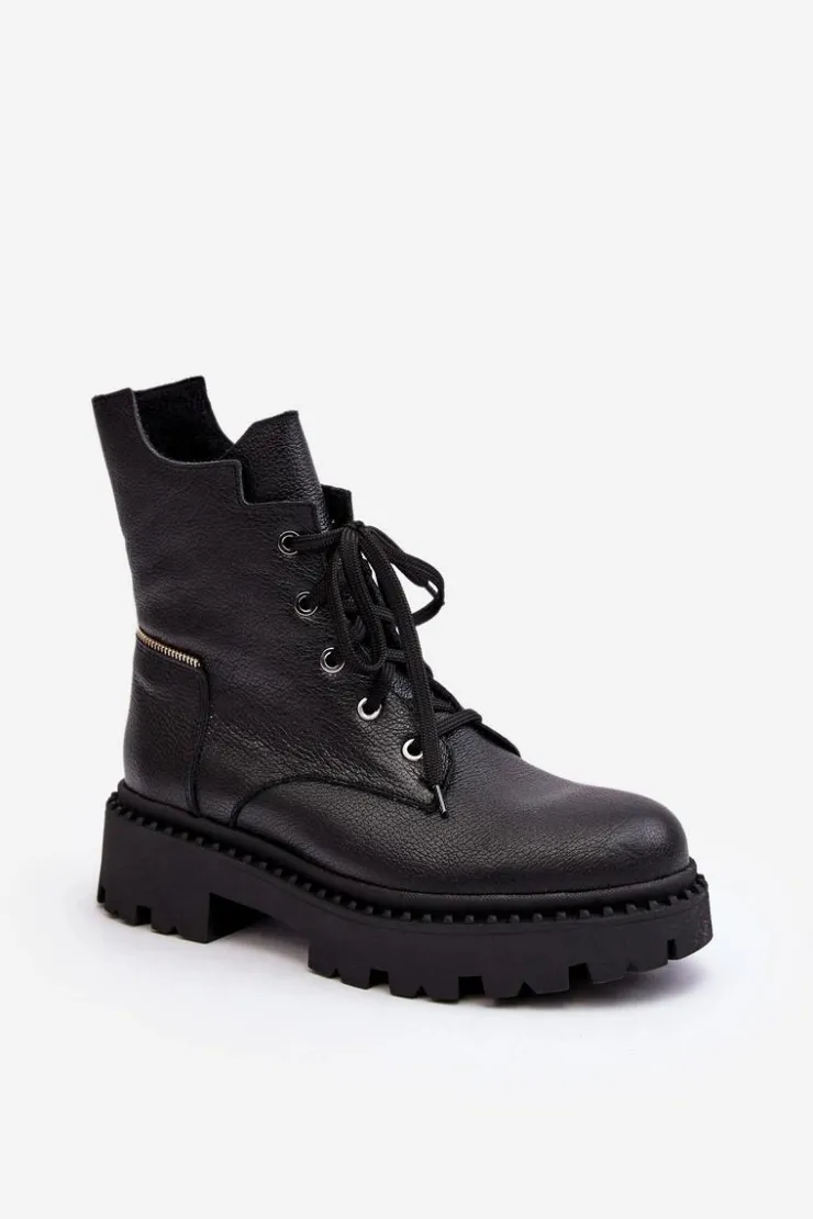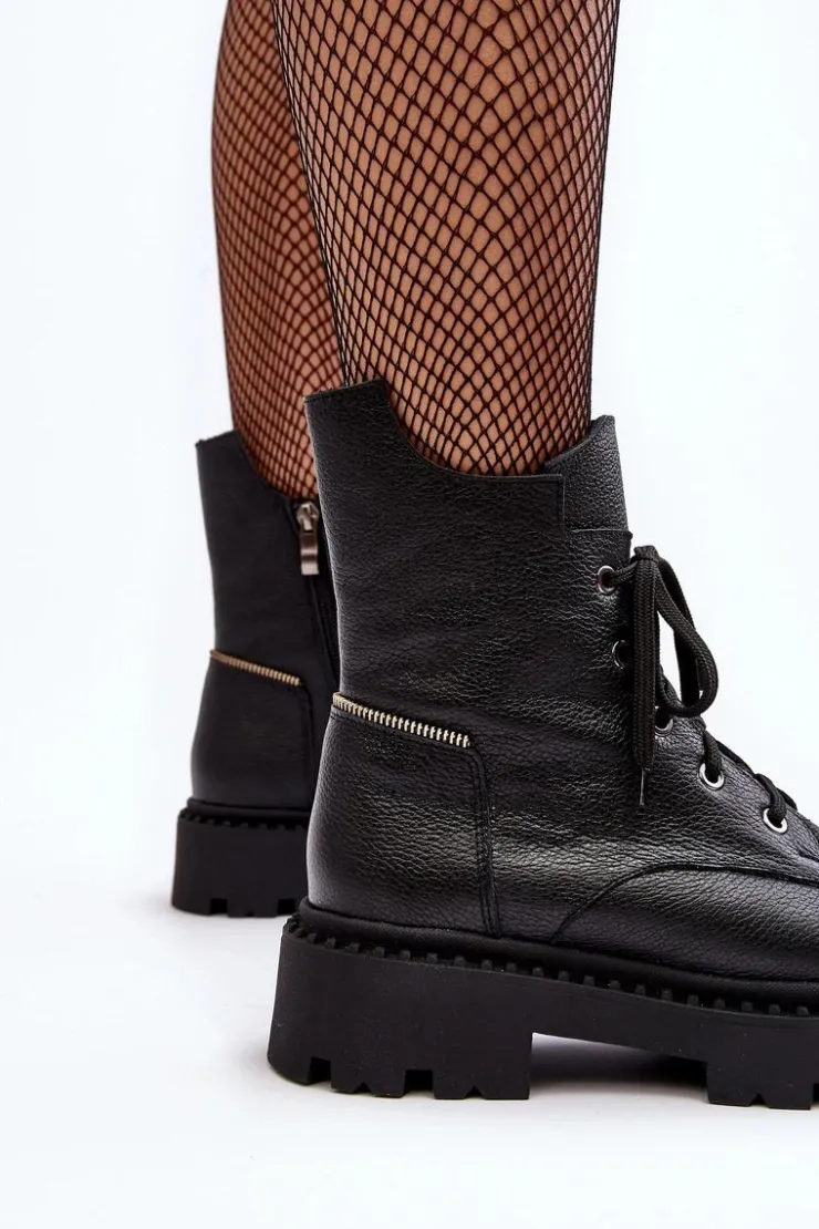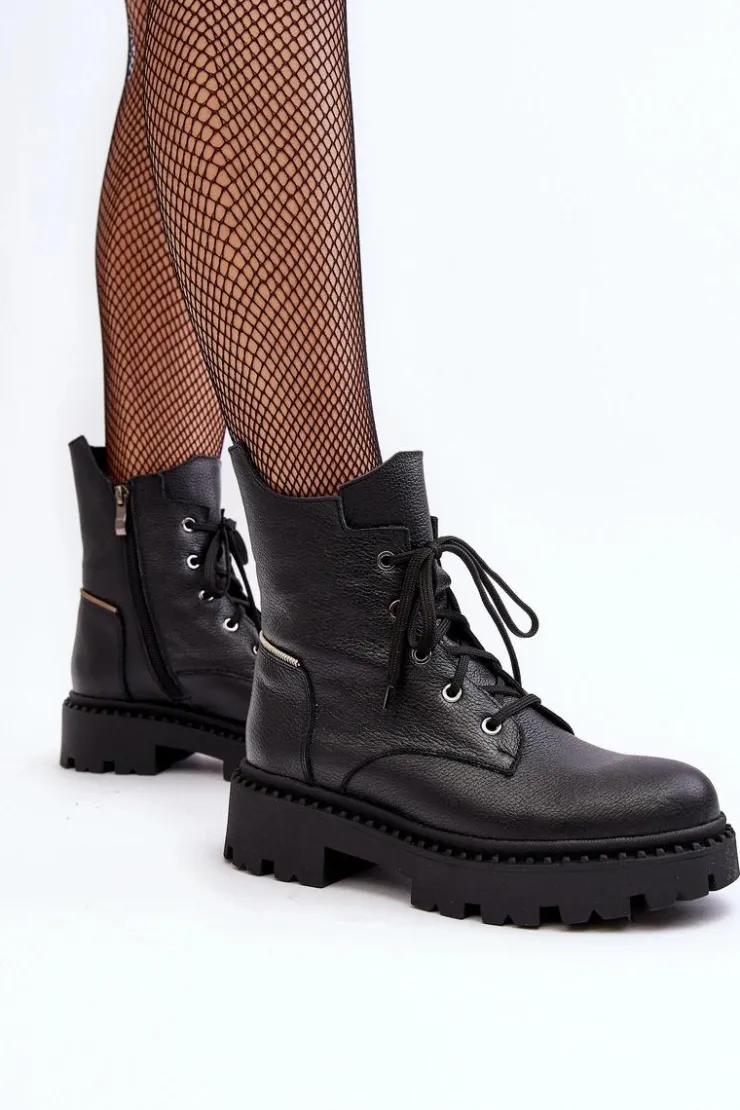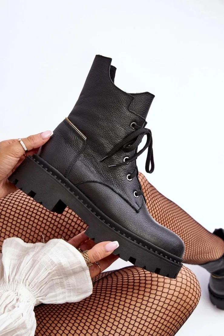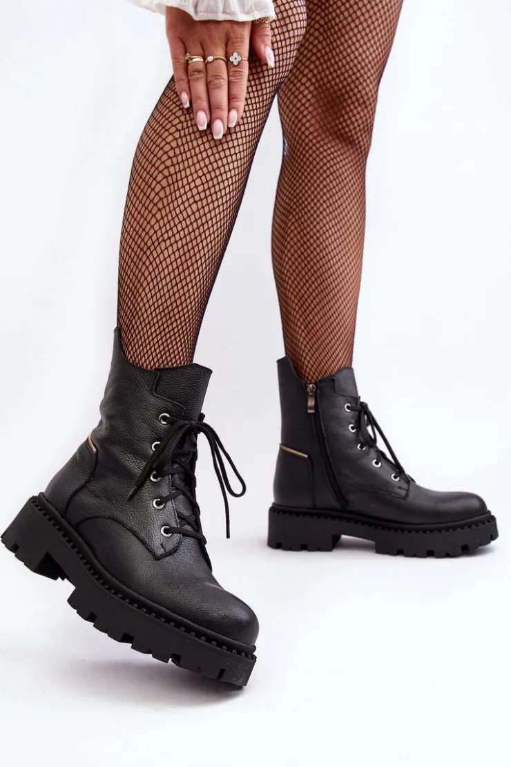 Botki damskie z cholewką za kostkę. Wykonane ze skóry naturalnej. Osadzone na płaskim obcasie oraz platformie. Zapinane na suwak. Noski zaokrąglone. Usztywniony zapiętek. Środek ocieplony kocem obuwniczym. Przy wyborze rozmiaru prosimy sugerować się tabelą rozmiarów.