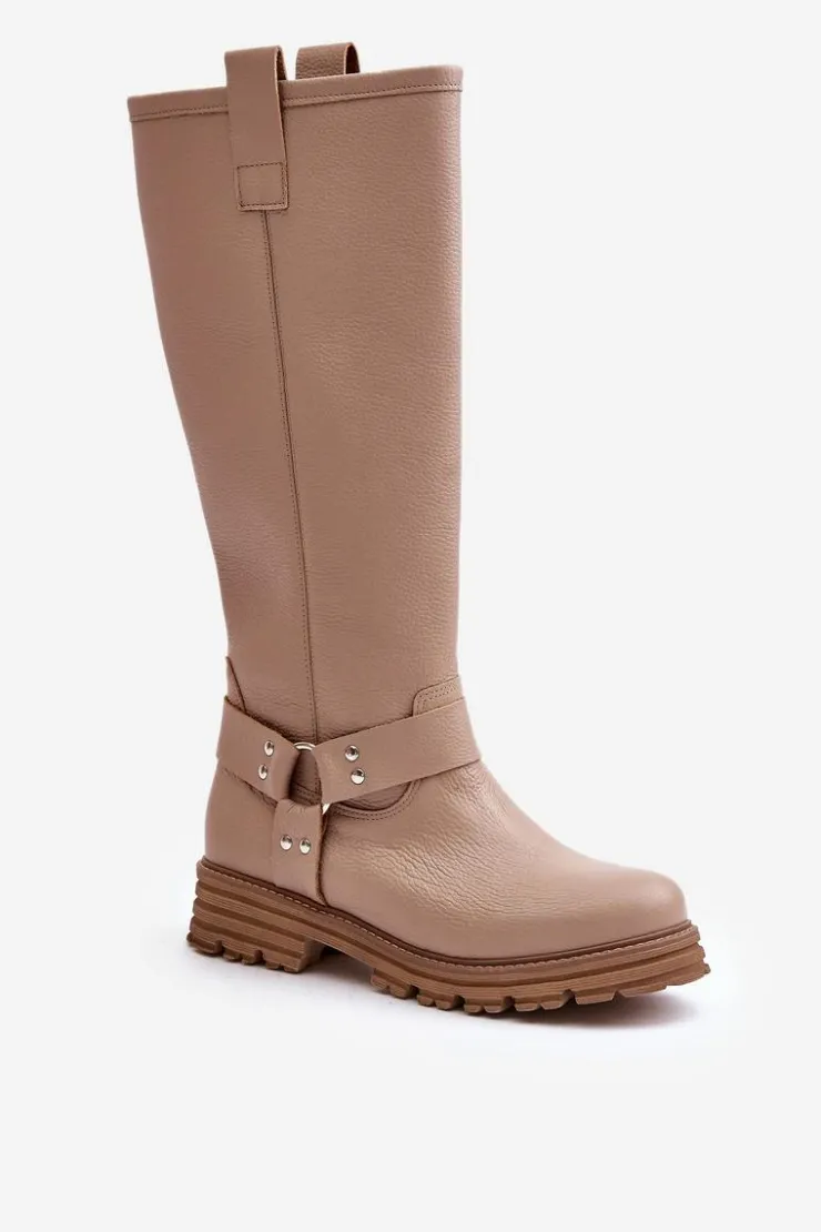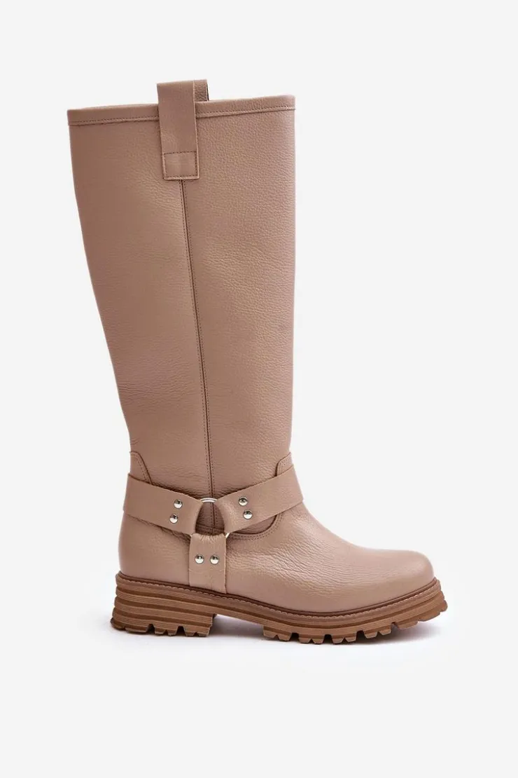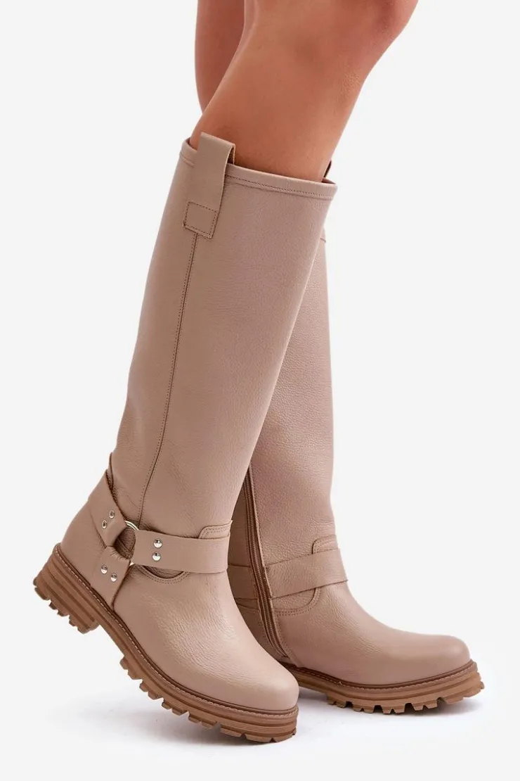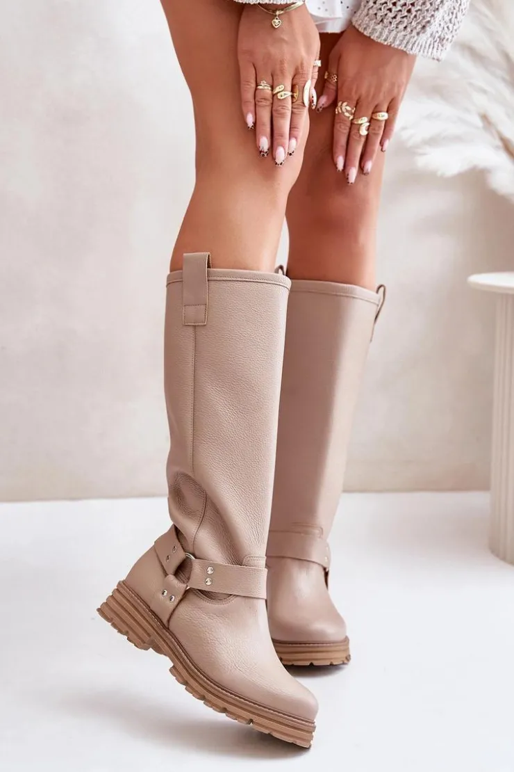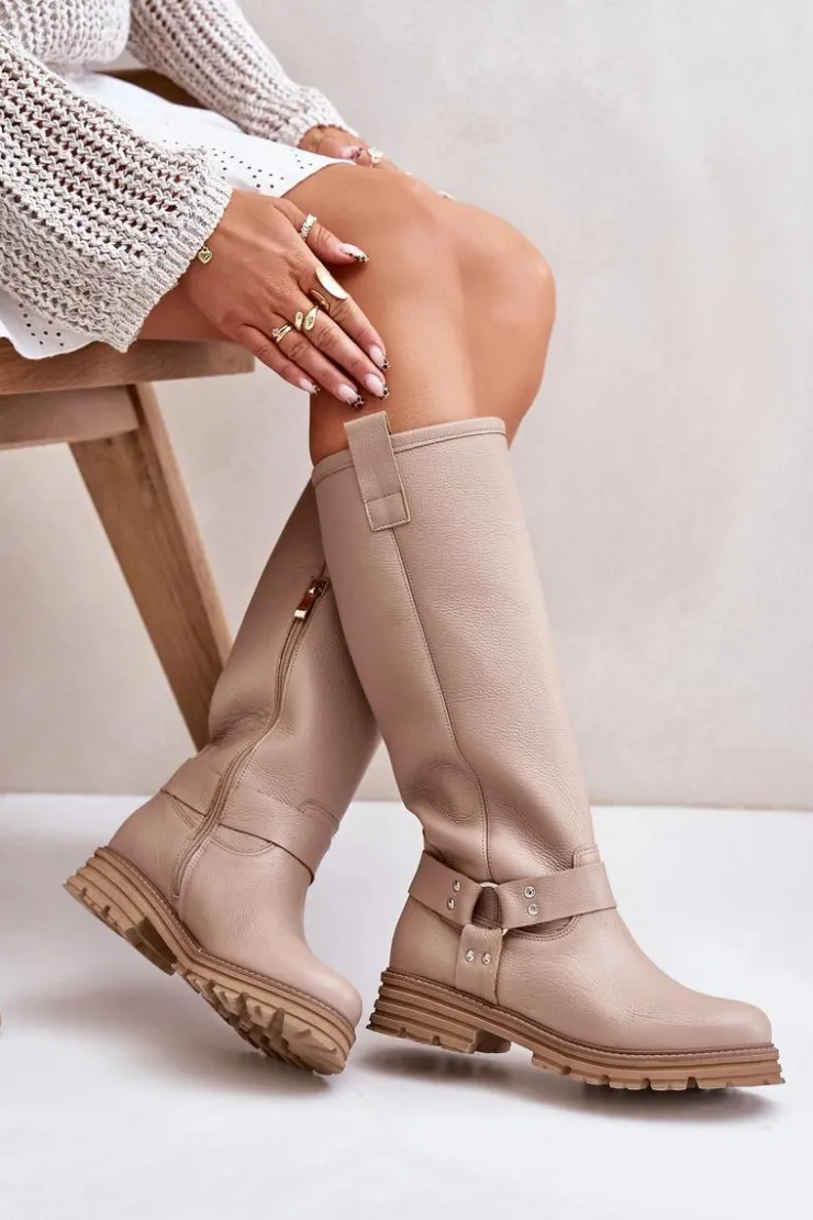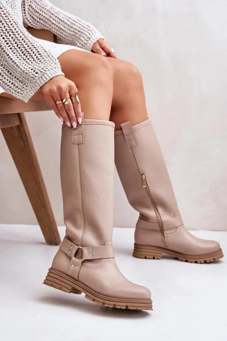 Damskie Zazoo Skórzane Kozaki Damskie Przed Kolano Lewski 3615 Beżowe