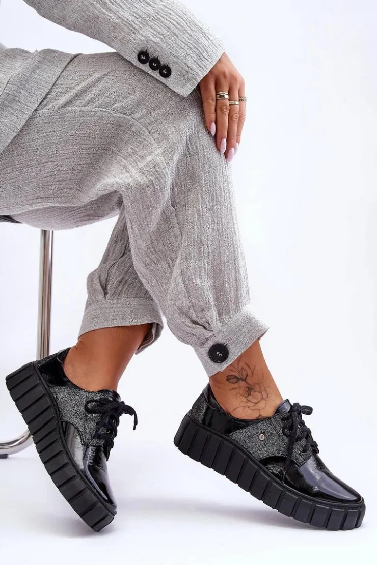 Półbuty posiadają wiązanie na ozdobione błyszczącą nicią sznurowadła. Osadzone na masywnej platformie ze żłobieniami po bokach. Wewnątrz wygodna wkładka ze skóry naturalnej, która jest dodatkowo profilowana. Cholewka przed kostkę została wykonana również z naturalnej skóry. Bardzo lekkie i komfortowe w użytkowaniu. Idealne do eleganckich spodni, tiulowych spódnic czy dzianinowych sukienek. Możesz je łączyć z różnymi stylizacjami – zawsze będą wyglądać świetnie! Te cudne buty zdecydowanie muszą znaleźć się w Twojej garderobie!Przy wyborze rozmiaru prosimy sugerować się tabelą rozmiarów.