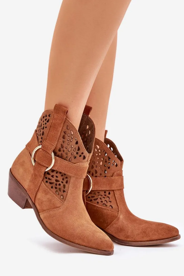 Damskie Zazoo Zamszowe Botki Kowbojki Ażurowe Na Obcasie 2994 Camel