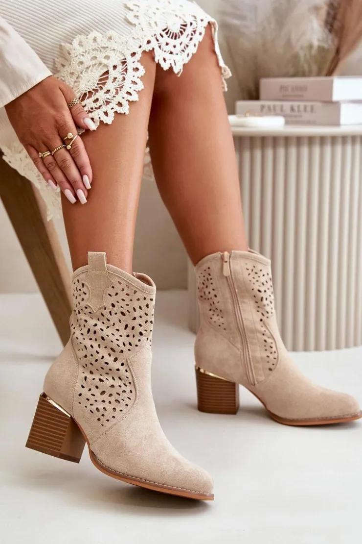 Damskie botki wykonane z eko zamszu, wyróżniają się ażurową cholewką, która sięga za kostkę. Osadzone na eleganckim słupkowym obcasie, ozdobionym złotym elementem, co dodaje im wyjątkowego charakteru. Zapinane na zamek, zapewniają wygodę użytkowania. Noski zaokrąglone, co podkreśla ich klasyczny i stylowy wygląd. Idealne do codziennych i eleganckich stylizacji. Przy wyborze rozmiaru prosimy sugerować się tabelą rozmiarów.