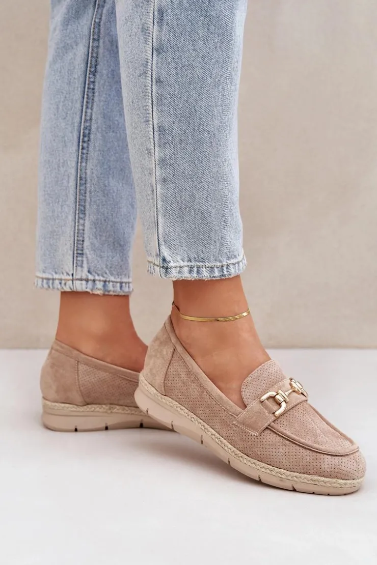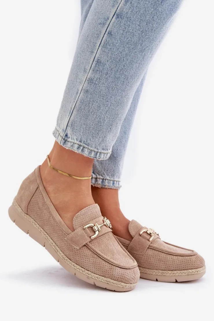 Damskie mokasyny z eko zamszu. Osadzone na delikatnej platformie z jutową plecionką. Przód ozdobiony złotym detalem, który nadaje elegancji. Noski zaokrąglone. Ten model jest nie tylko stylowy, ale również funkcjonalny dzięki ażurowej cholewce, która umożliwia stopie oddychanie. Idealne do wielu wiosennych stylizacji! Przy wyborze rozmiaru prosimy sugerować się tabelą rozmiarów.