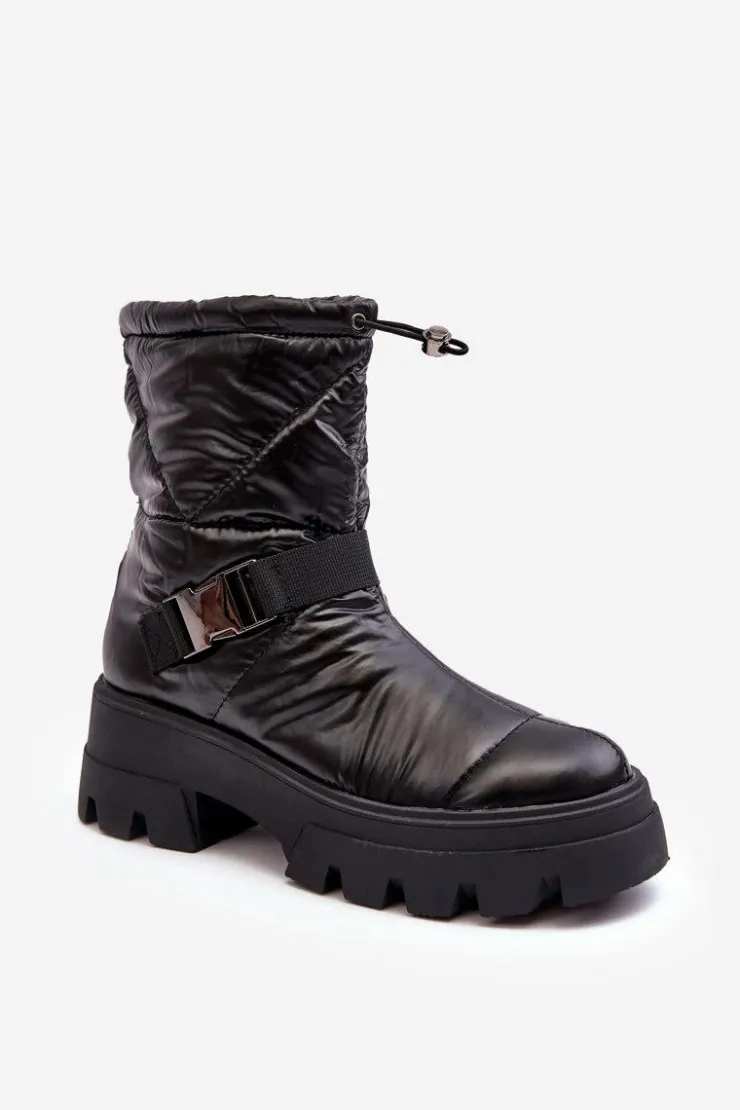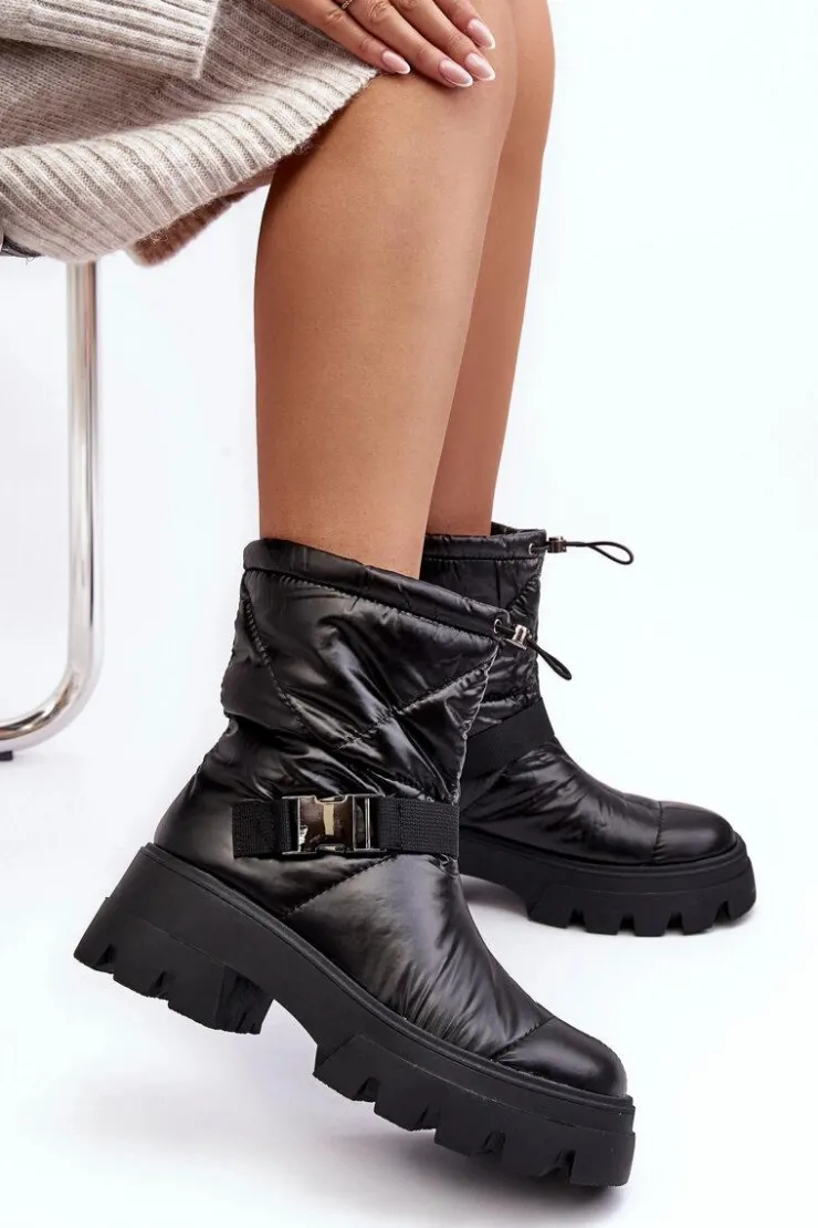 Botki damskie wykonane z materiału tekstylnego. Osadzone na masywnej podeszwie oraz płaskim obcasie. Model wsuwany ze ściągaczem na górze cholewki. Zapiętek jest usztywniony. Noski zaokrąglone. Środek nie jest ocieplony. Przy wyborze rozmiaru prosimy sugerować się tabelą rozmiarów.