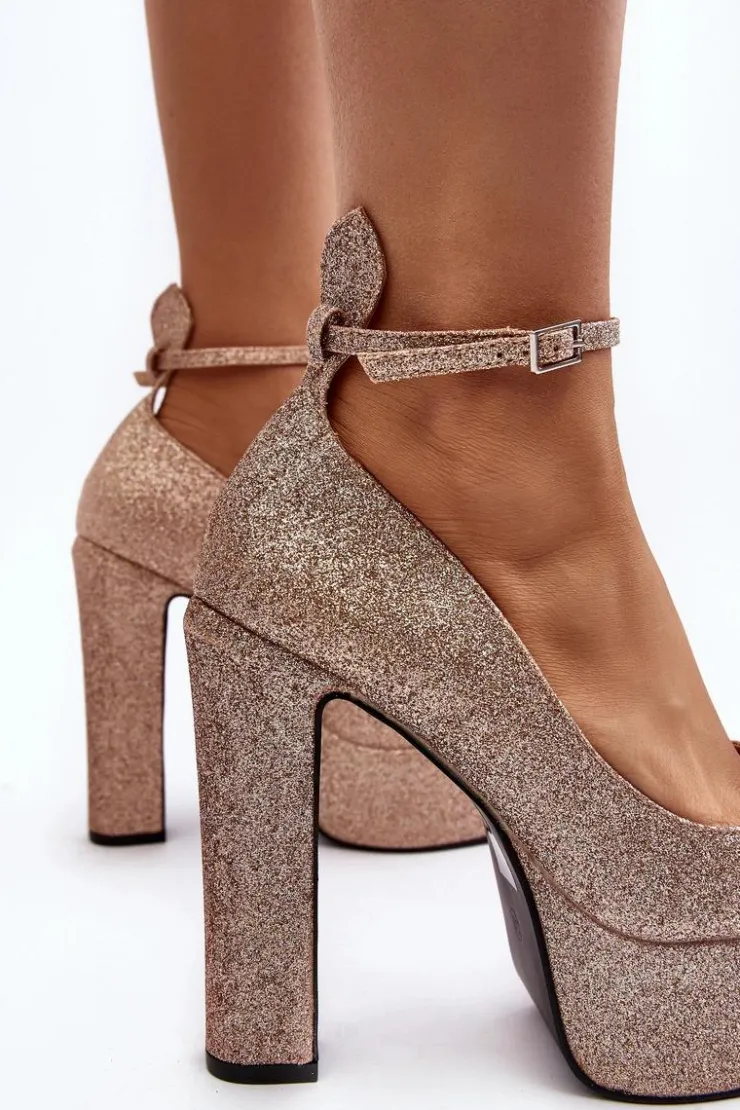 Brokatowe czółenka na słupku z masywną platformą z pewnością zachwycą kobiety, które kochają wysokie obcasy! Zapinane na sprzączkę z regulowanym paskiem. Miękka, eko skórzana wkładka zapewni komfort podczas użytkowania. Idealne na wieczorne wyjścia! Przy wyborze rozmiaru prosimy kierować się tabelą rozmiarów
