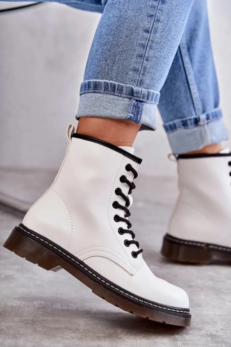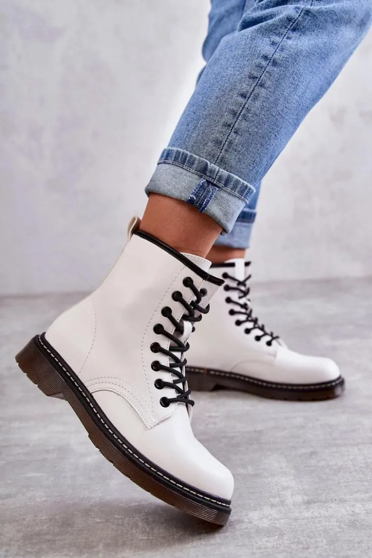 Damskie botki z cholewką za kostkę zostały wykonane z tworzywa. Model ten posiada usztywniany zapiętek. Botki wiązane na okrągłe sznurowadła. Osadzone na niskiej platformie i płaskim obcasie wykonanym z tworzywa gumowego. Są antypoślizgowe. W środku posiadają ocieplenie w postaci koca obuwniczego. Sprawdź także pozostałe modele botków! Przy wyborze rozmiaru prosimy sugerować się tabelą rozmiarów.
