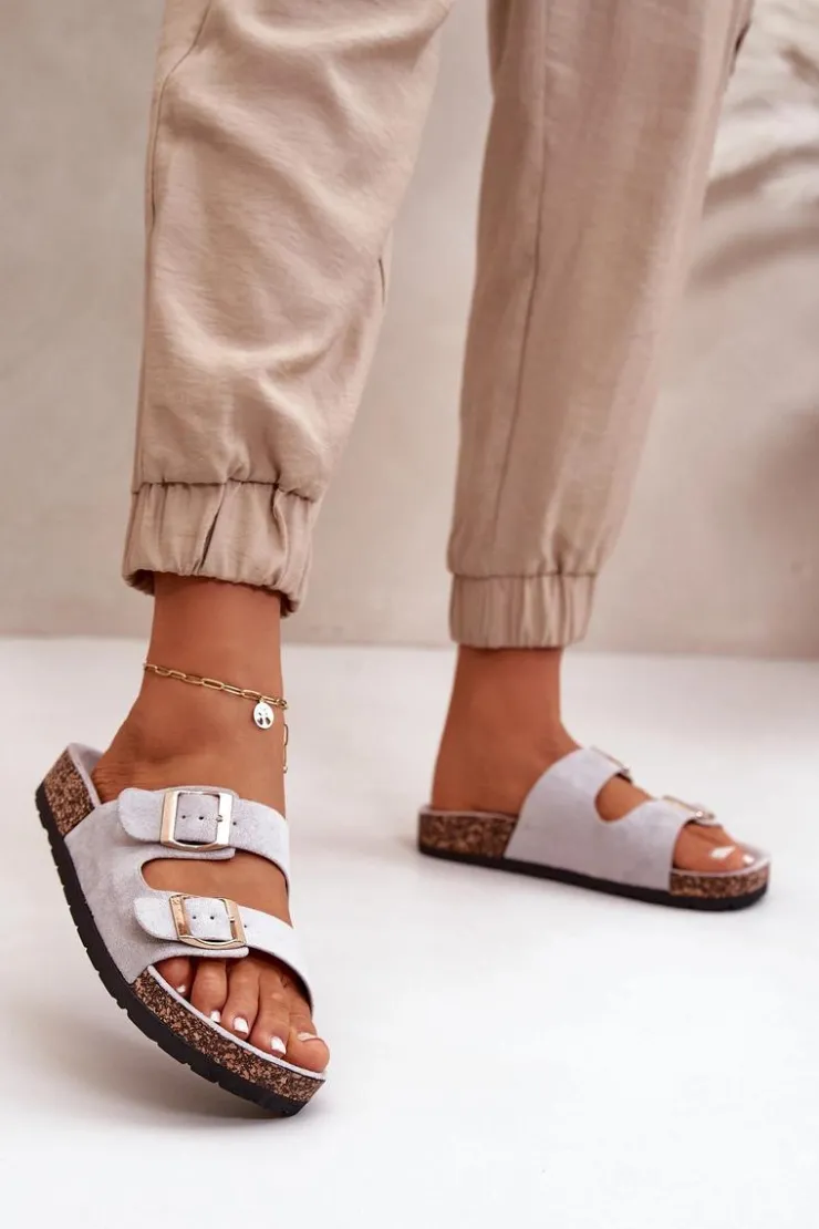 Klapki te posiadają dwa szerokie paski zapinane na sprzączkę, które można regulować. Idealne na letnie spacery oraz codzienne wyjścia na zakupy. Profilowana, wykonana z eko zamszu wkładka zapewni wygodę oraz komfort. Podeszwa została wykonana z tworzywa sztucznego. Klapki te sprawiają, że Twoje stopy będą wypoczęte i zrelaksowane. Przy wyborze rozmiaru prosimy sugerować się tabelą rozmiarów.