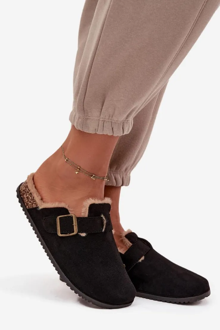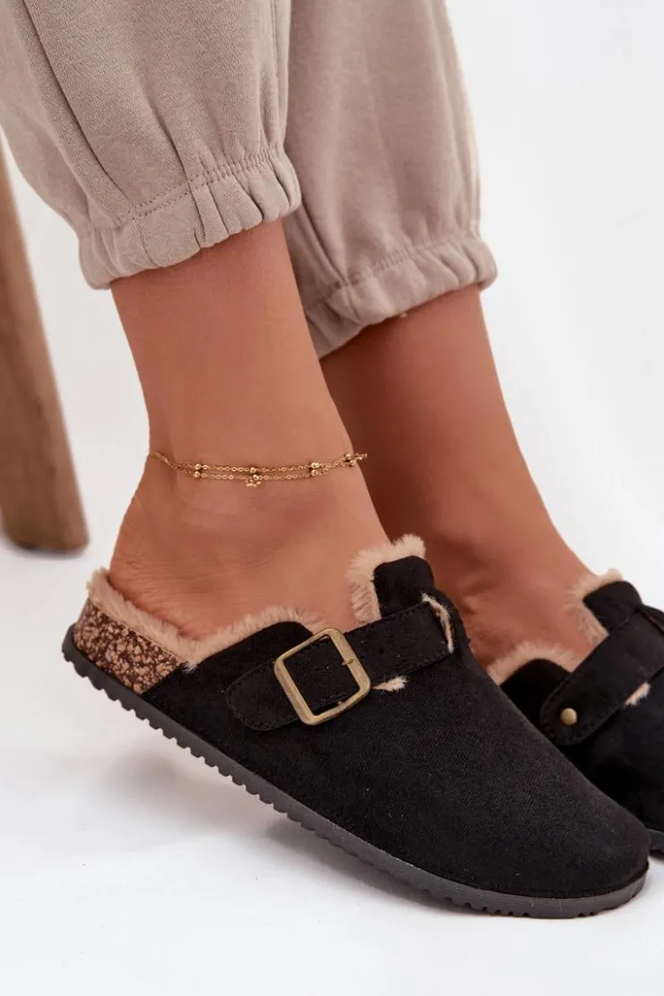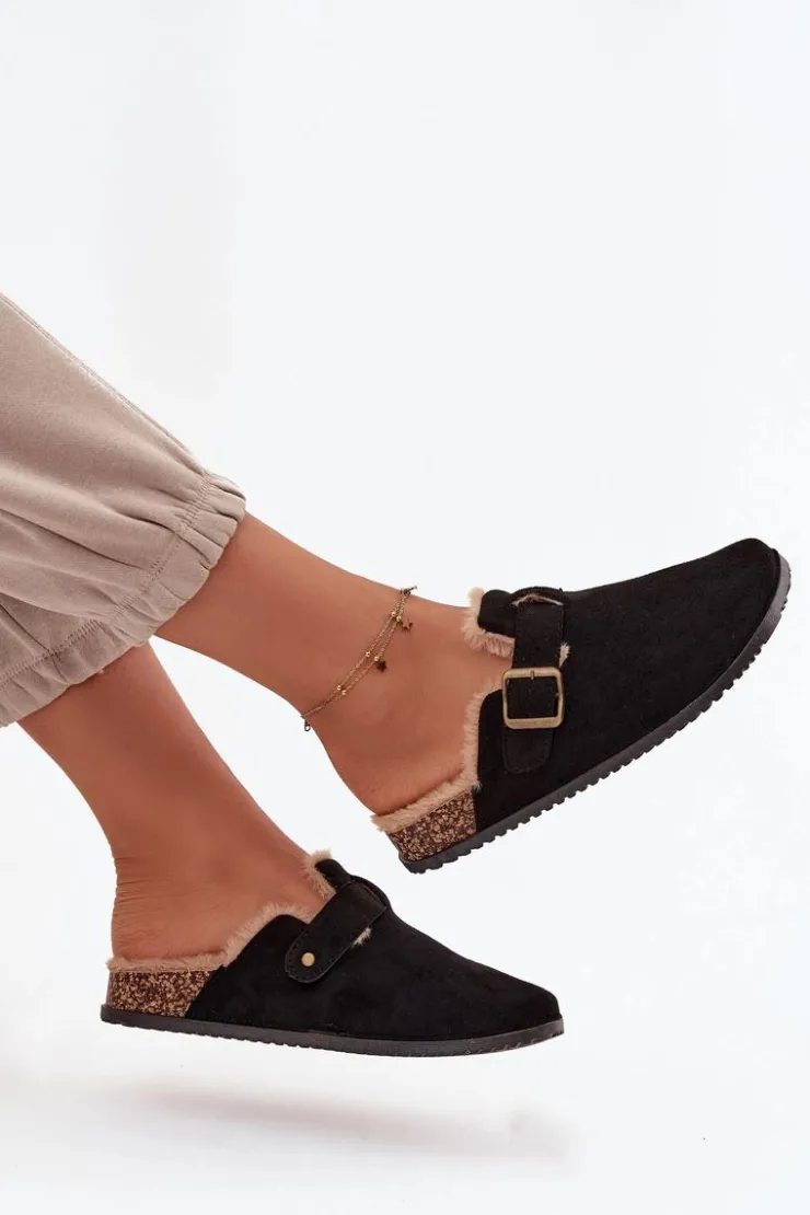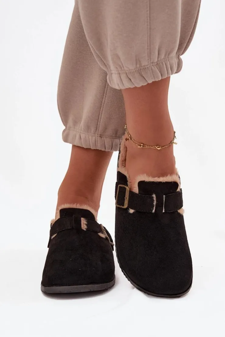 Damskie klapki typu chodaki wykonane z eko zamszu to doskonałe połączenie wygody i stylu. Model został ocieplony miękkim futerkiem, które zapewnia przyjemne ciepło i komfort podczas noszenia. Regulowany pasek z klamrą pozwala idealnie dopasować obuwie do stopy, a szerokie, zaokrąglone noski gwarantują swobodę ruchów. To praktyczne i modne chodaki, które świetnie sprawdzą się zarówno w domu, jak i podczas codziennych wyjść. Przy wyborze rozmiaru prosimy sugerować się tabelą rozmiarów.