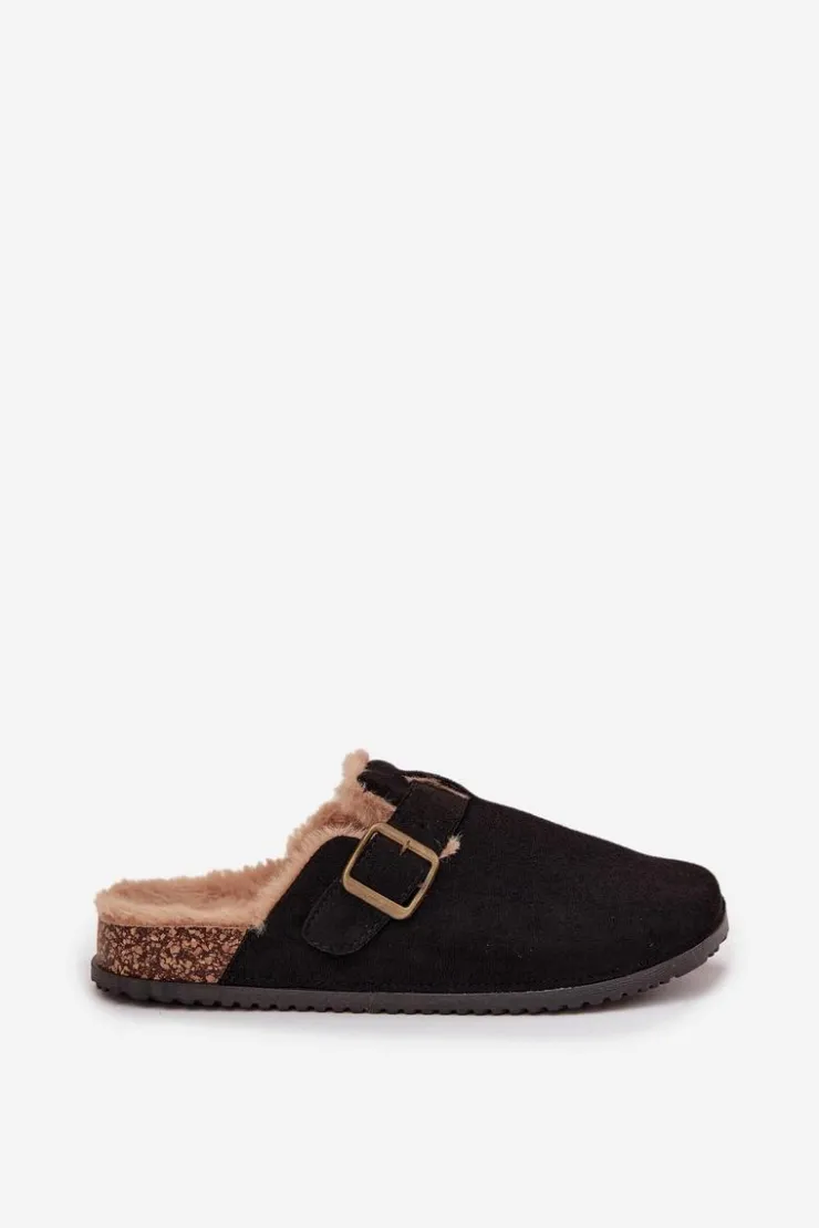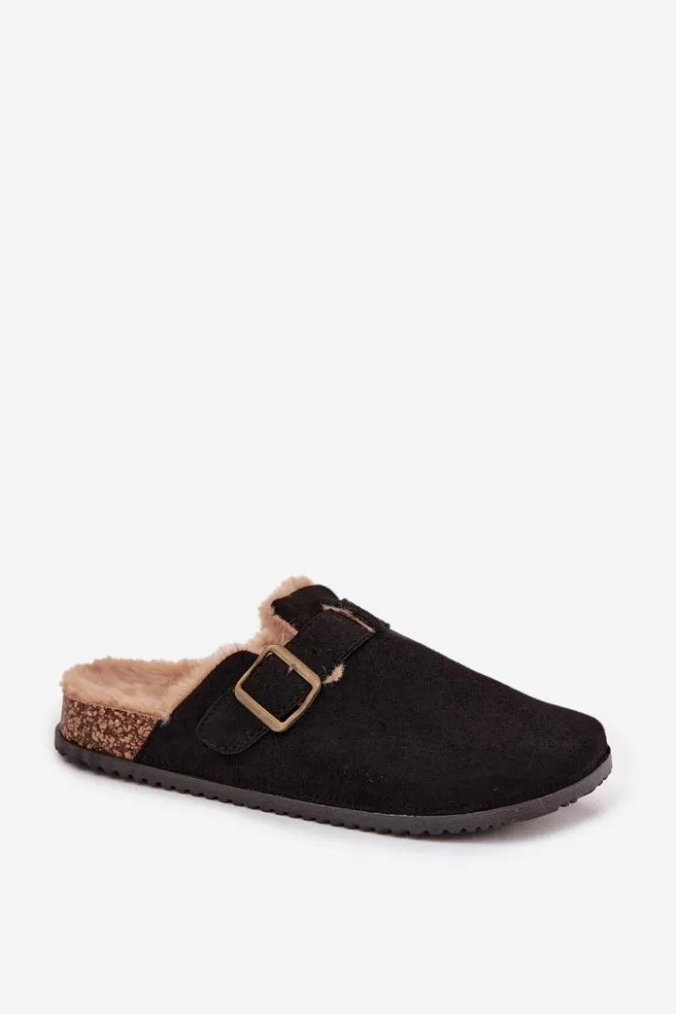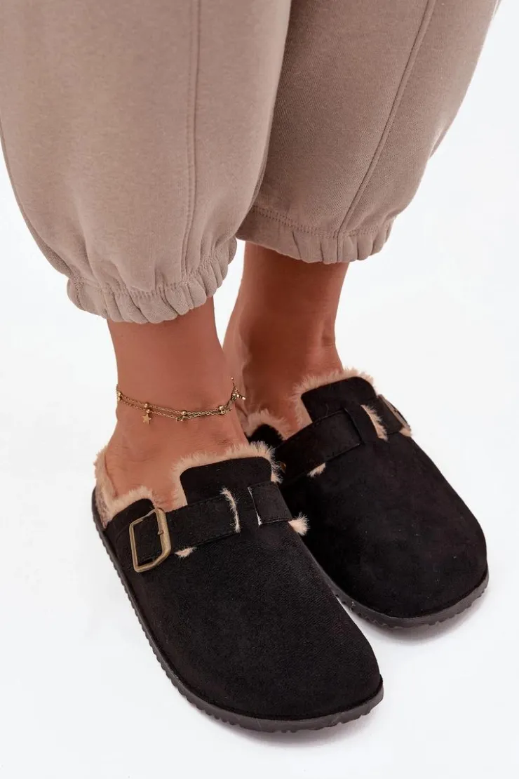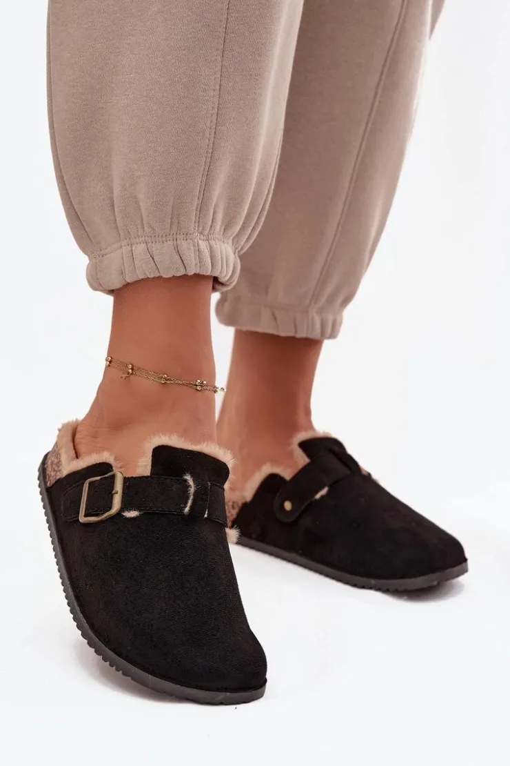 Damskie klapki typu chodaki wykonane z eko zamszu to doskonałe połączenie wygody i stylu. Model został ocieplony miękkim futerkiem, które zapewnia przyjemne ciepło i komfort podczas noszenia. Regulowany pasek z klamrą pozwala idealnie dopasować obuwie do stopy, a szerokie, zaokrąglone noski gwarantują swobodę ruchów. To praktyczne i modne chodaki, które świetnie sprawdzą się zarówno w domu, jak i podczas codziennych wyjść. Przy wyborze rozmiaru prosimy sugerować się tabelą rozmiarów.