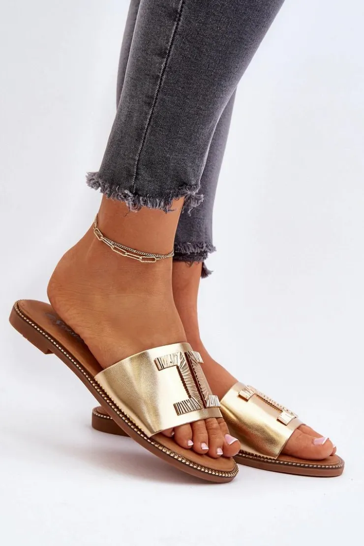 Klapki damskie na płaski obcasie, który gwarantuje stabilność i wygodę podczas noszenia. Na przodzie złota ozdoba, która dodaje im elegancji i subtelności. Model ten doskonale uzupełni letnie stylizacje! Przy wyborze rozmiaru prosimy sugerować się tabelą rozmiarów.