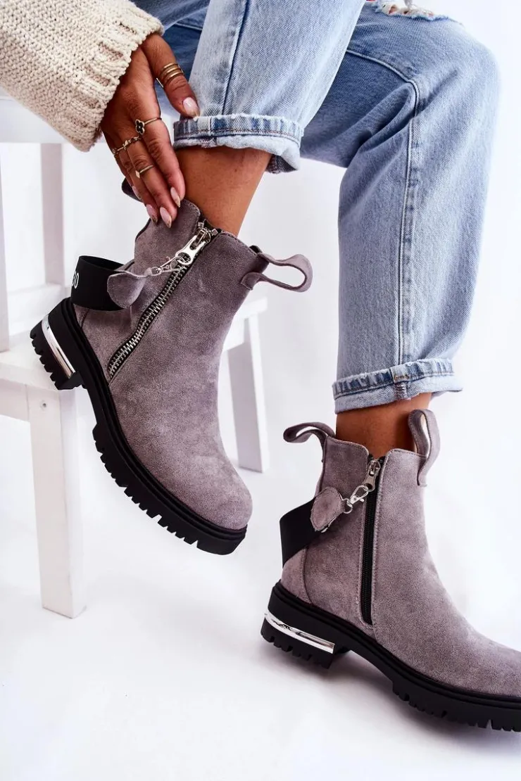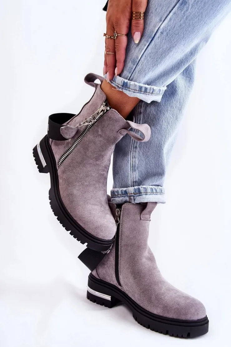 Botki damskie zostały wykonane z eko zamszu. Wnętrze ocieplone jest miłym w dotyku kocem obuwniczym. Dołączony do butów pasek jest odpinany. Botki posiadają dwa zamki, gdzie jeden z nich jest nieodpinany. Buty te osadzono na płaskim obcasie z lustrzaną wstawką i podeszwie z bieżnikiem. Świetny model do wielu jesiennych stylizacji! Przy wyborze rozmiaru prosimy sugerować się tabelą rozmiarów.