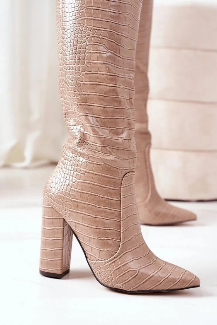Piękne kozaki na słupku wykonane z eko skóry. Buty ocieplone są kocem obuwniczym. Przy wyborze rozmiaru prosimy sugerować się tabelą rozmiarów.