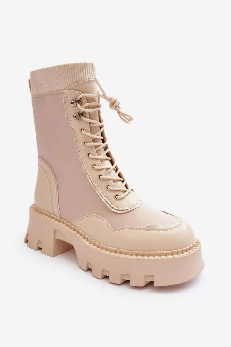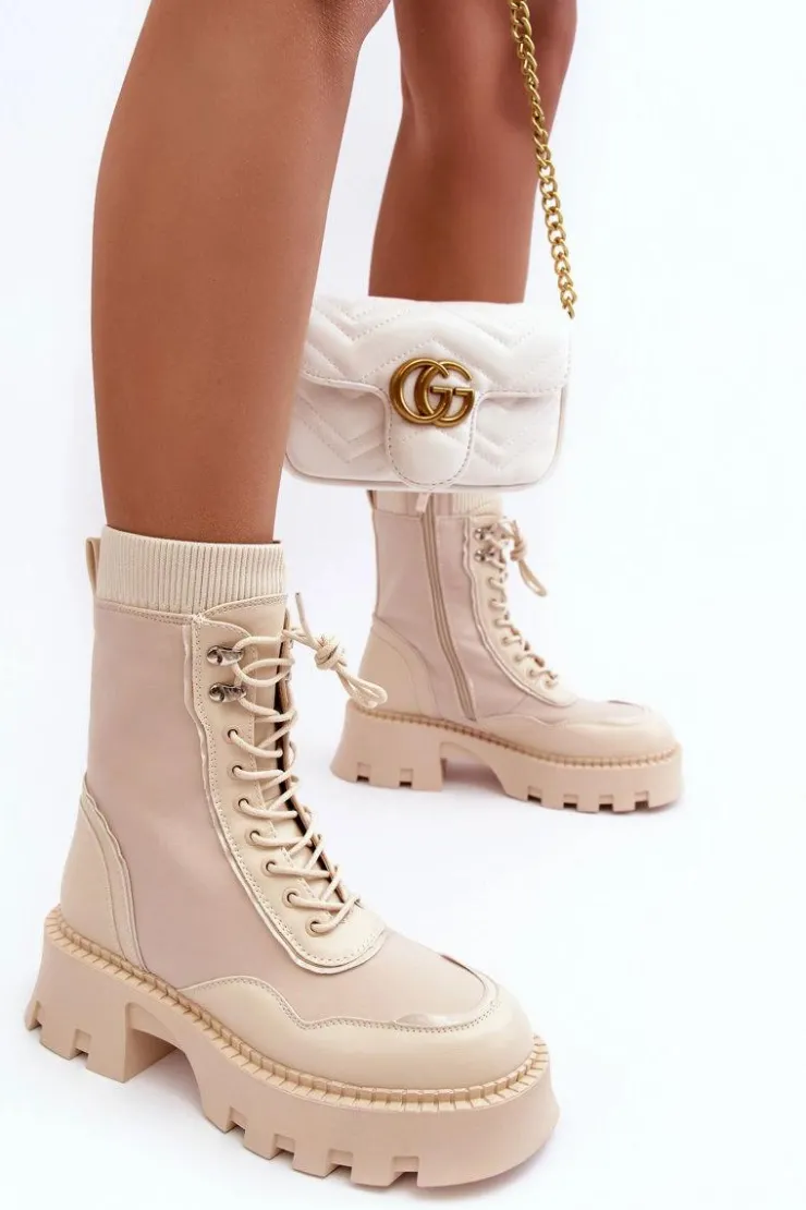 Workery damskie osadzone na masywnym, płaskim obcasie oraz platformie. Wykonane z połączenia eko skóry i materiału tekstylnego. Z przodu sznurowane oraz dodatkowo zapinane na suwak po wewnętrznej stronie cholewki. Noski zaokrąglone. Środek ocieplony kocem obuwniczym. Sprawdź całą naszą kolekcję wysokich botków! Przy wyborze rozmiaru prosimy sugerować się tabelą rozmiarów.