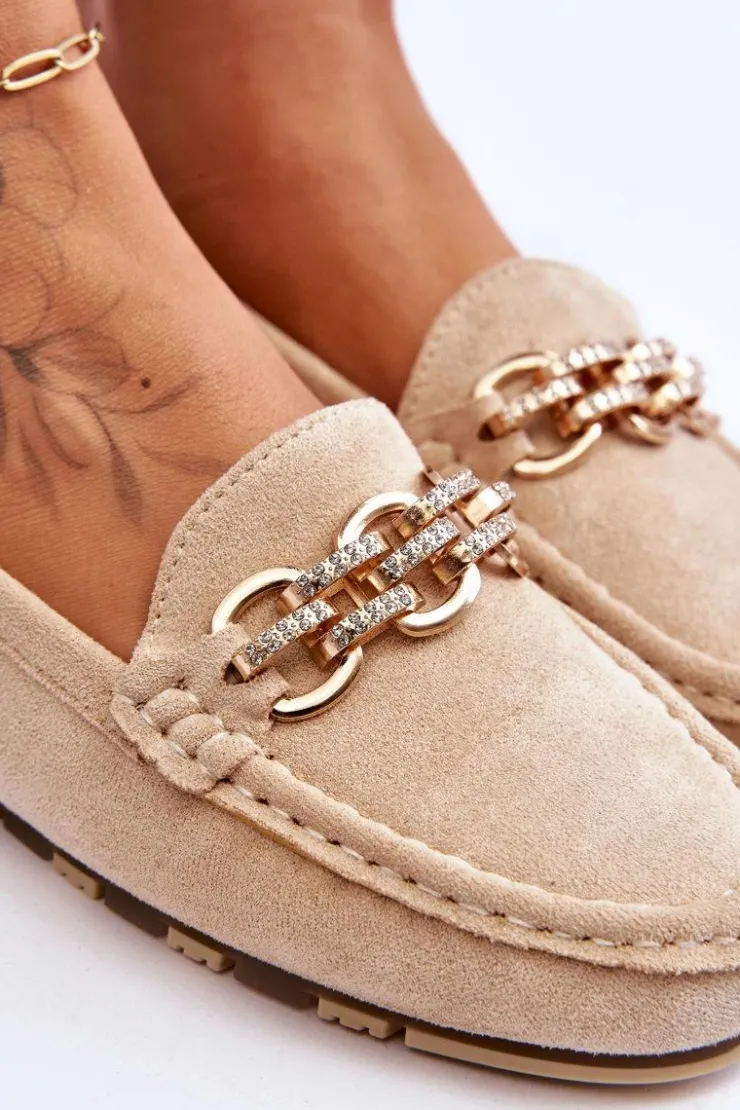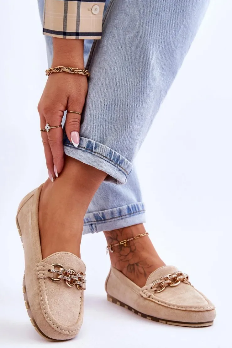 Mokasyny damskie zostały wykonane z eko zamszu. Posiadają na przodzie ozdobny łańcuszek z dżetami. Mokasyny zostały osadzone na platformie z gumową, antypoślizgową podeszwą. Miękka wkładka z eko skóry zapewni komfortowe użytkowanie. Koniecznie powinnaś je mieć! Przy wyborze rozmiaru prosimy sugerować się tabelą rozmiarów.