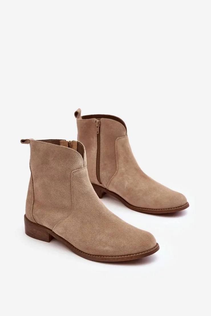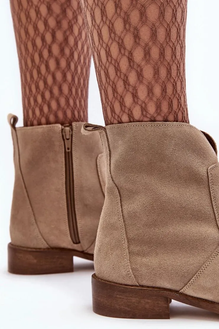 Botki damskie wykonane ze skóry naturalnej. Osadzone na płaskim obcasie. Cholewka za kostkę. Zapinane na suwak z boku. Wkładka wykonana również ze skóry naturalnej zapewni komfort podczas użytkowania. Noski zaokrąglone. Zapiętek usztywniony. Nieocieplane. Przy wyborze rozmiaru prosimy sugerować się tabelą rozmiarów.