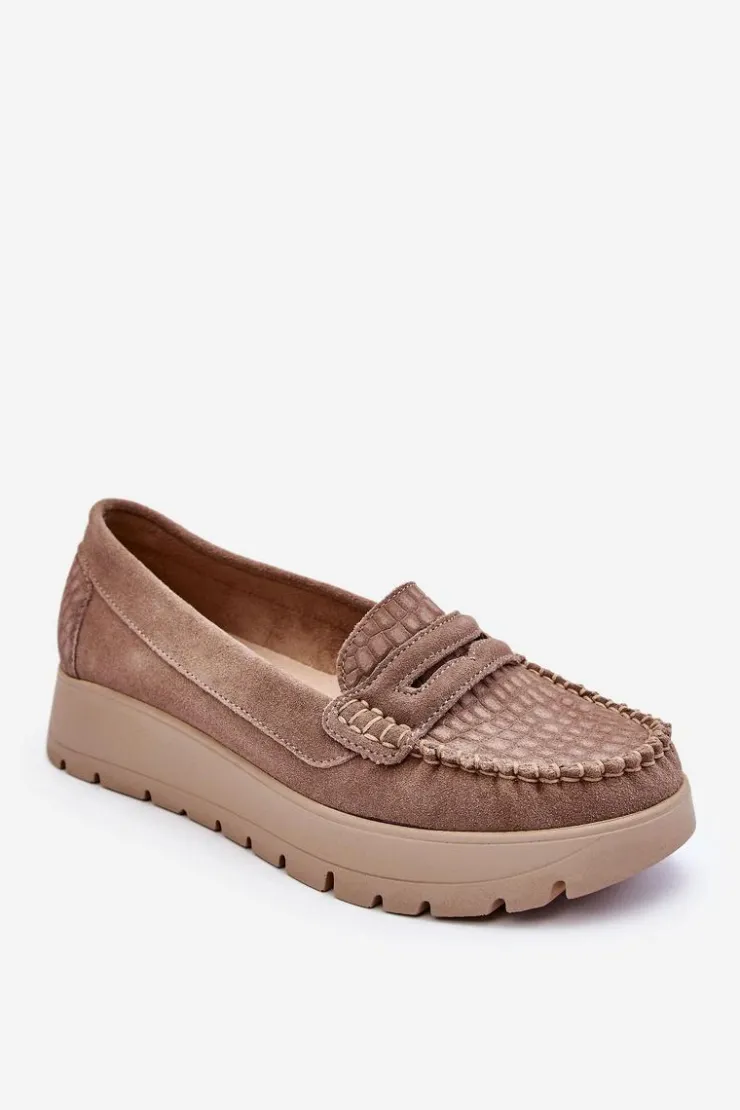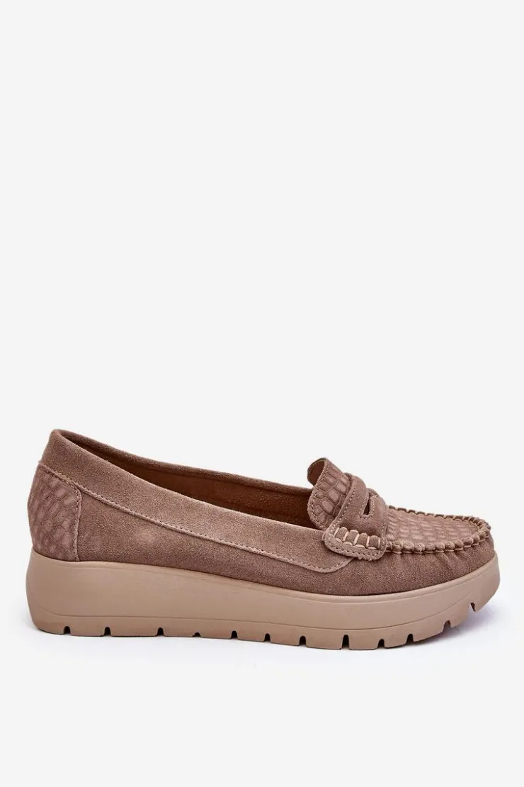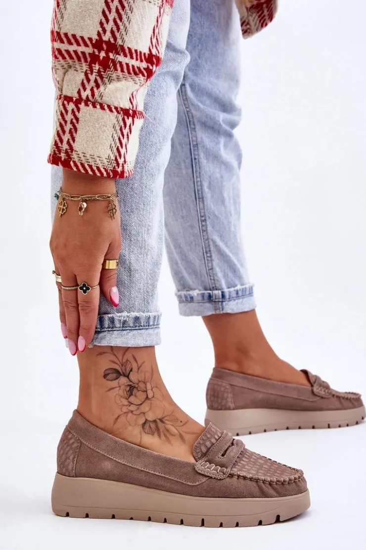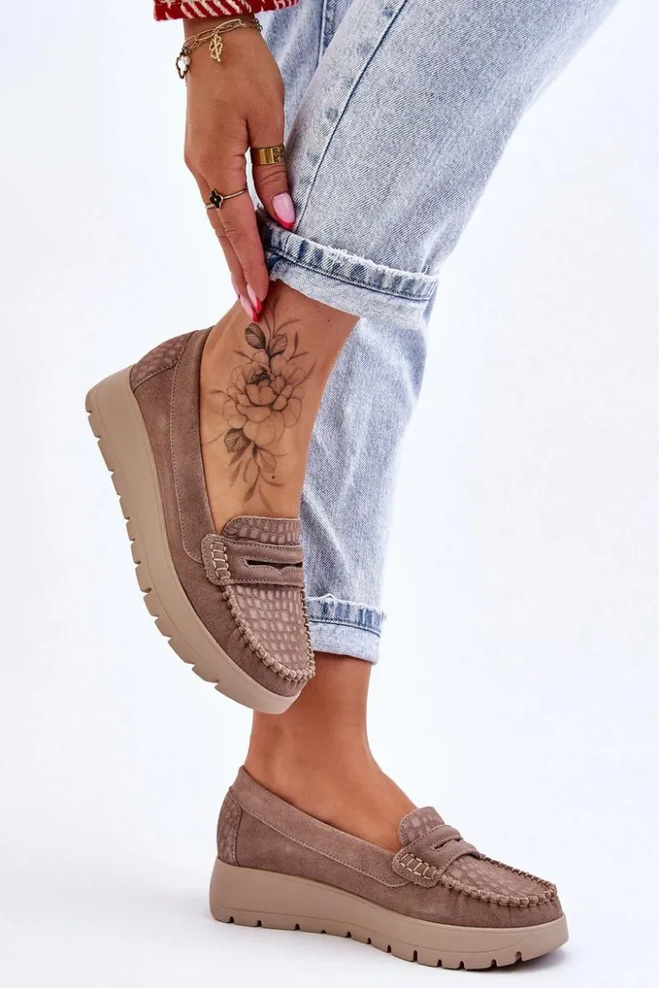 Mokasyny damskie wykonane z naturalnej skóry z ozdobnym paseczkiem z przodu. Zapiętek został usztywniony, co pozwoli na odpowiednią stabilizację stopy. Buty osadzono na platformie. Ten model posiada miękką wkładkę z perforacją. Mokasyny to idealne buty do wielu stylizacji! Koniecznie powinnaś je mieć! Przy wyborze rozmiaru prosimy sugerować się tabelą rozmiarów.