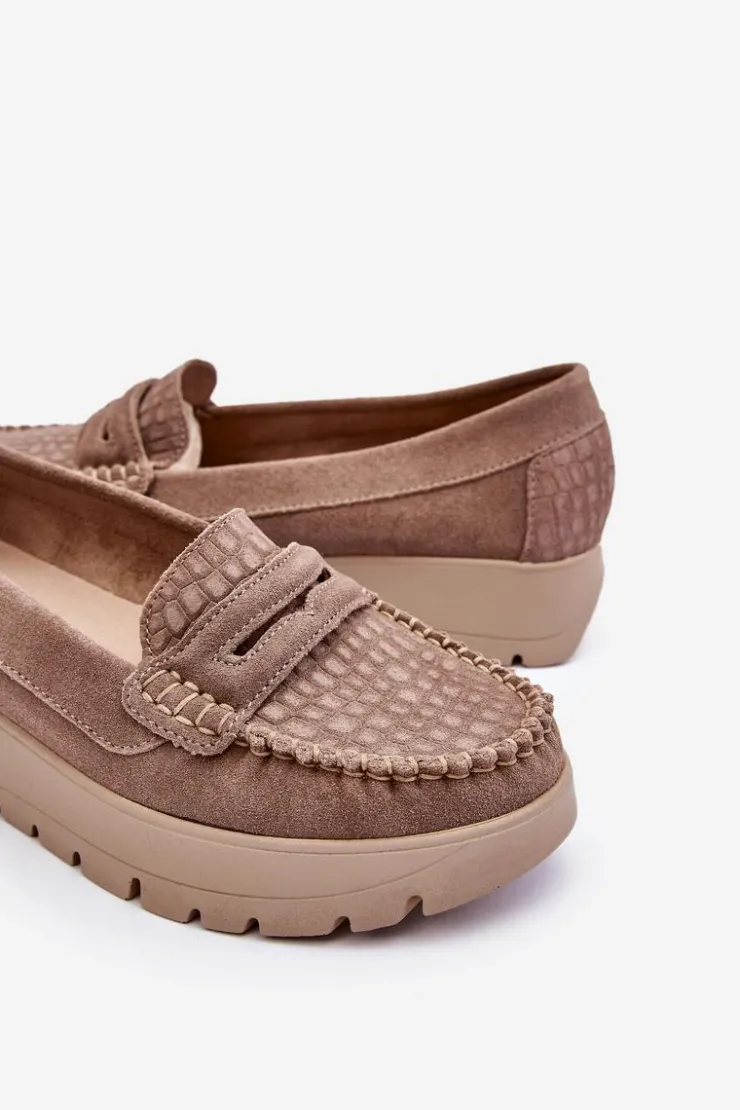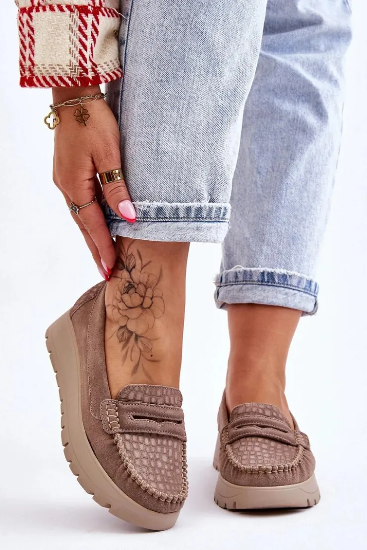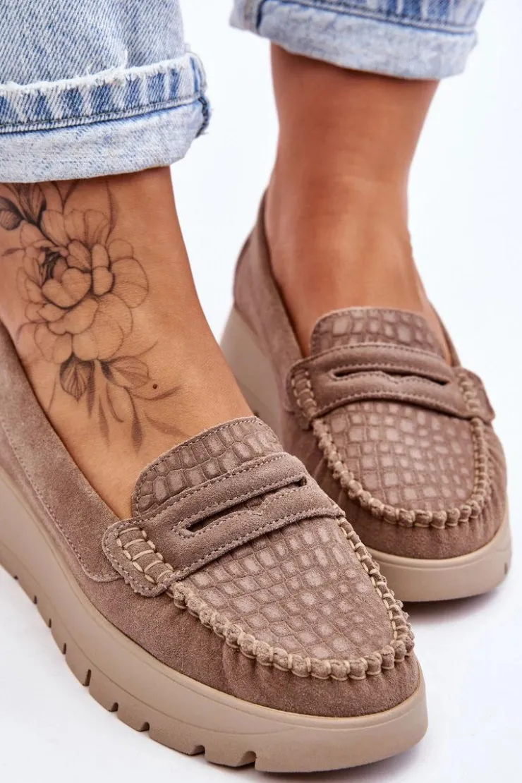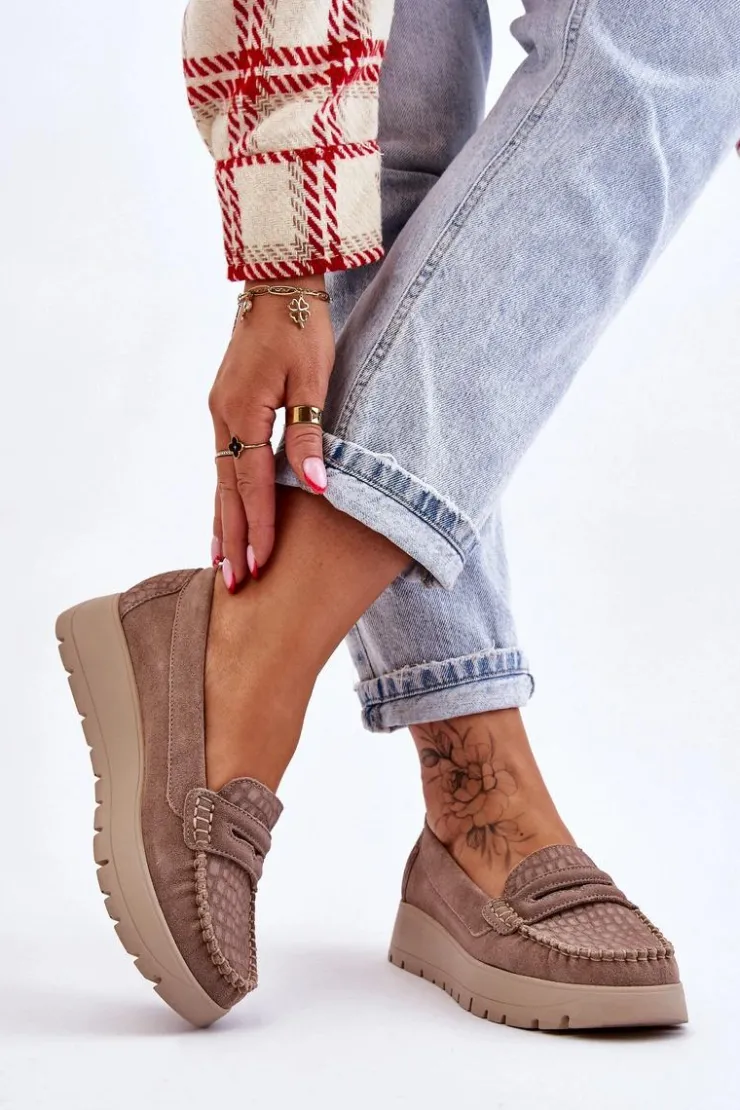 Mokasyny damskie wykonane z naturalnej skóry z ozdobnym paseczkiem z przodu. Zapiętek został usztywniony, co pozwoli na odpowiednią stabilizację stopy. Buty osadzono na platformie. Ten model posiada miękką wkładkę z perforacją. Mokasyny to idealne buty do wielu stylizacji! Koniecznie powinnaś je mieć! Przy wyborze rozmiaru prosimy sugerować się tabelą rozmiarów.