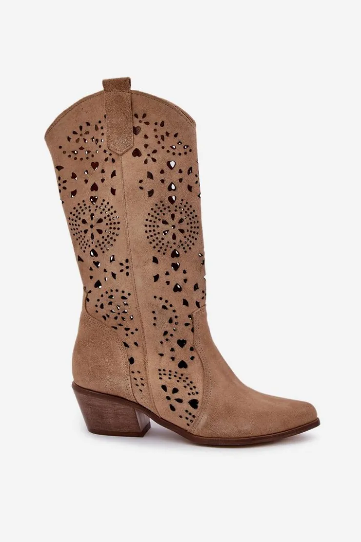 Kozaki z ażurową cholewką do połowy łydki. Model w stylu kowbojek. Zapinane na suwak. Noski w szpic optycznie wysmuklą nogi. Miękka, skórzana wkładka zapewni wygodę podczas użytkowania. Ażurowe kozaki to idealny wybór do wielu stylizacji! Przy wyborze rozmiaru prosimy sugerować się tabelą rozmiarów.