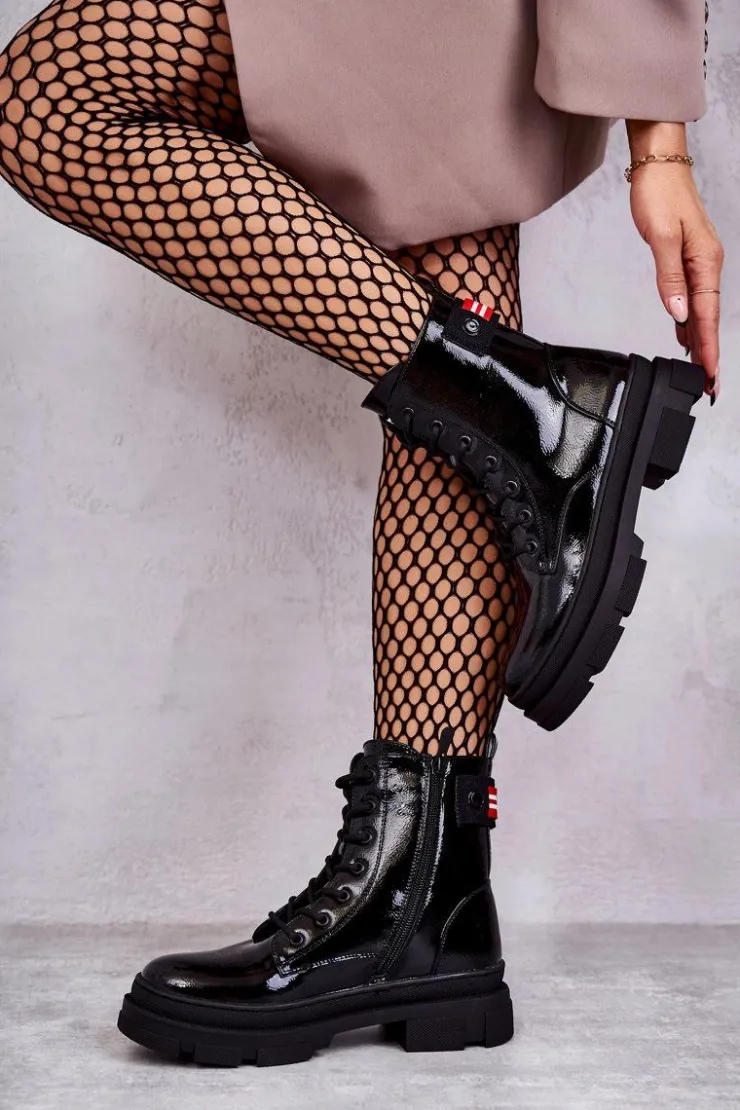 Modne, damskie botki zostały wykonane z wysokiej jakości eko skóry. Posiadają klasyczne sznurowanie oraz suwak z boku cholewki. Dodatkowo z tyłu umieszczono materiałowy pasek. Zapiętek jest usztywniany. Botki osadzono na płaskim obcasie. Środek został ocieplony miękkim kocem obuwniczym. Ten model powinien znaleźć się w Twojej szafie! Przy wyborze rozmiaru prosimy sugerować się tabelą rozmiarów.