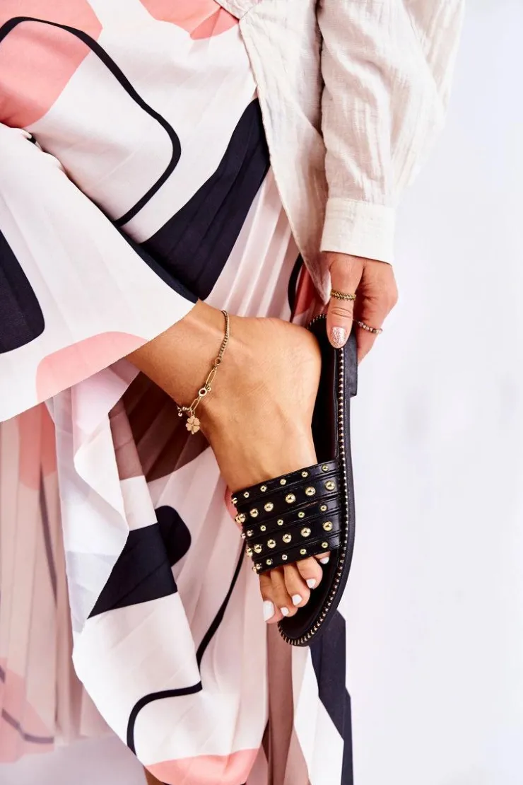 Wyjątkowe klapki damskie z modnymi, ozdobnymi ćwiekami. Wykonane z eko skóry. Miękka wkładka Comfort Shoes wykonana z eko skóry jest bardzo wygodna w użytkowaniu. Klapki posiadają wokół podeszwy delikatne zdobienie. Nosek odkryty, zaokrąglony. Osadzone na płaskim obcasie, z podeszwą wykonaną z tworzywa sztucznego. Solidny model, idealny na letnie dni! Przy wyborze rozmiaru prosimy sugerować się tabelą rozmiarów.