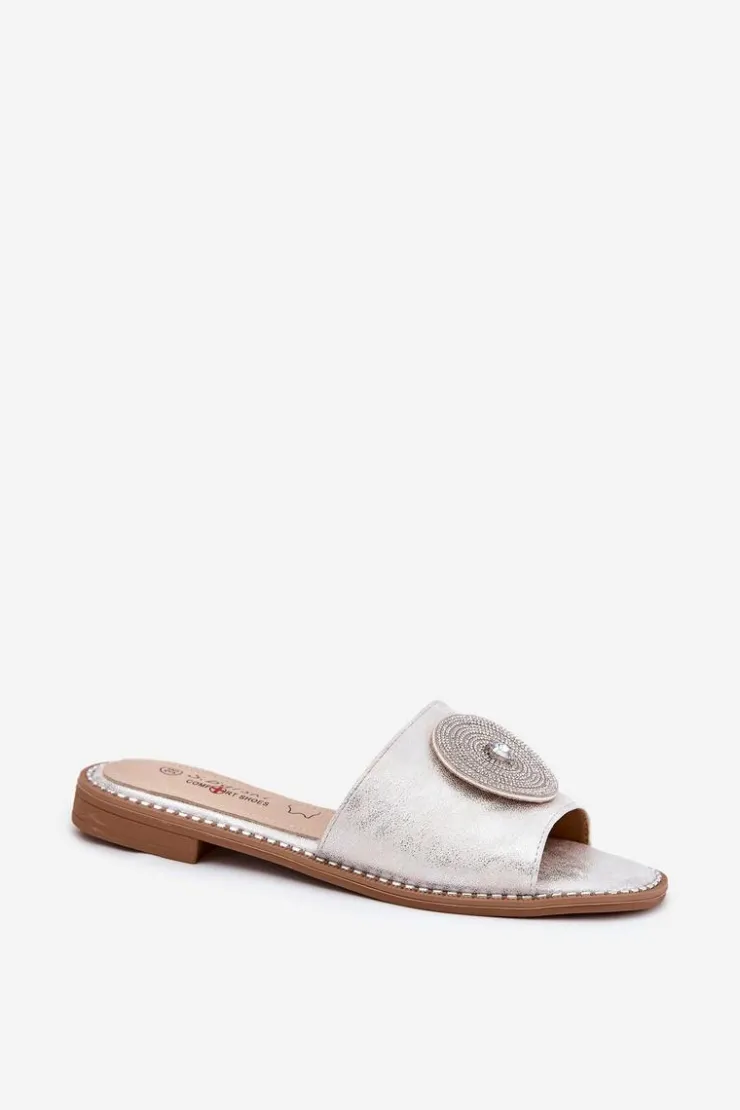 Discount Damskie buty S.Barski Klapki Damskie Na Płaskim Obcasie Z Ozdobą S.Barski KV51-013 Srebrne Srebrny