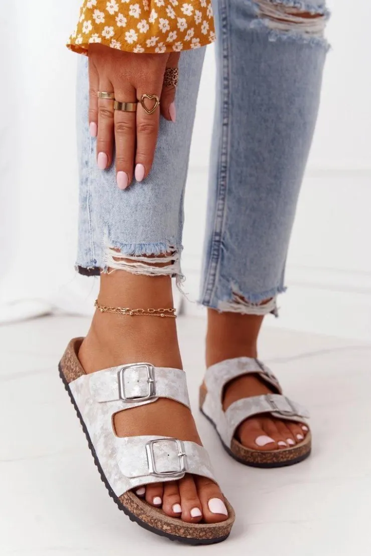 Discount Evento Damskie Klapki Na Korku Z Klamrami Srebrne Vivio Szary