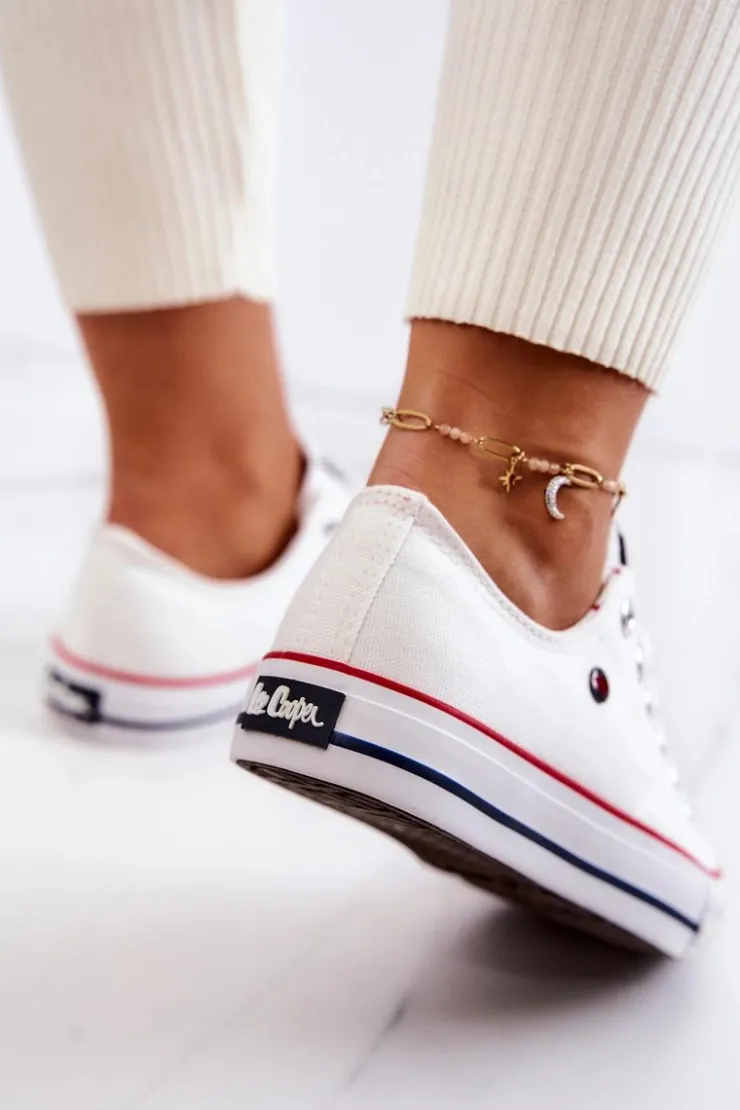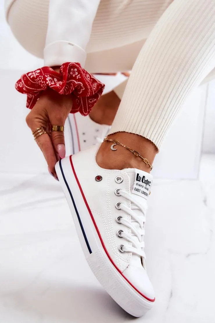Damskie trampki marki Lee Cooper. Klasyczny model świetnie będzie komponował się z jeansami, ale także ze zwiewnymi sukienkami. Buty posiadają miękką, materiałową wkładkę oraz antypoślizgową podeszwę. Model wiązany. Nosek wzmocniony gumowym tworzywem. Koniecznie sprawdź całą naszą kolekcję butów marki Lee Cooper. Przy wyborze rozmiaru prosimy sugerować się tabelą rozmiarów.
