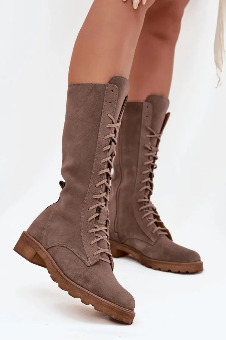 Damskie botki z naturalnego zamszu to doskonała propozycja na każdą okazję. Sięgające do połowy łydki, idealnie eksponują nogę, dodając jej smukłości. Cała długość cholewki została ozdobiona sznurowaniem, które nie tylko przyciąga wzrok, ale również pozwala na idealne dopasowanie do nogi. Dodatkowo botki zapinane są na zamek, co ułatwia ich zakładanie i zdejmowanie. Te botki stanowią świetny wybór do codziennych, jak i bardziej eleganckich stylizacji. Przy wyborze rozmiaru prosimy sugerować się poniższą tabelą rozmiarów.