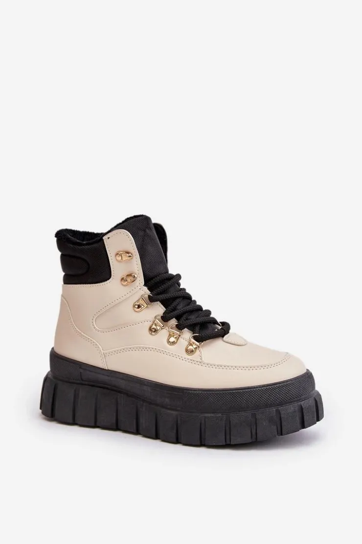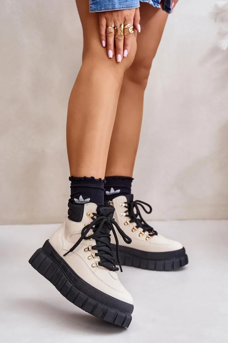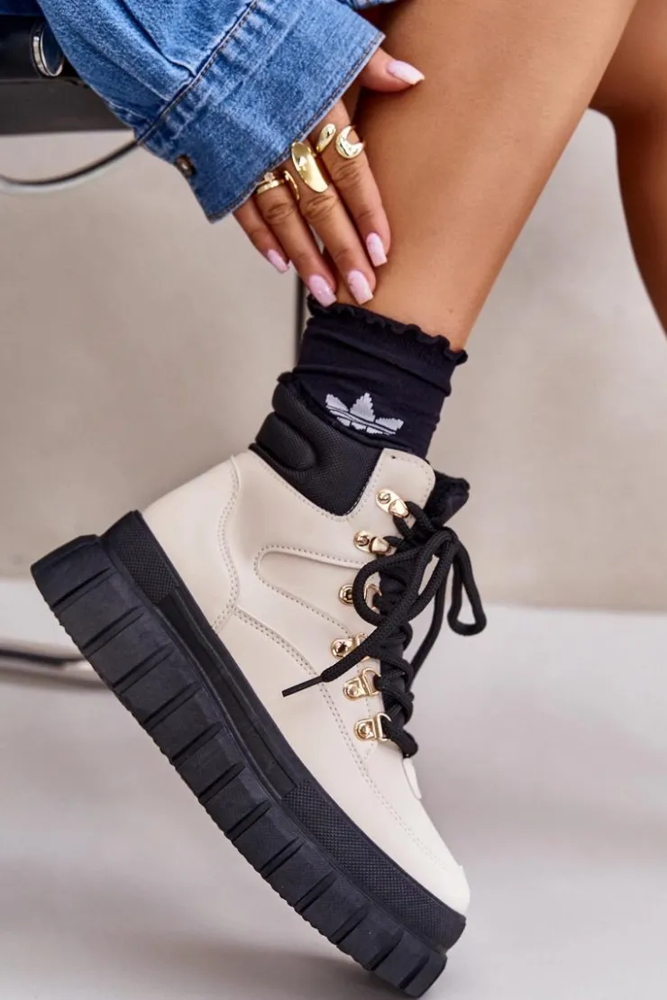 Damskie botki wykonane z eko skóry Osadzone na masywnej platformie, która doskonale odizoluje od zimnego podłoża. Model ten posiada sznurowanie oraz dodatkowe zapięcie na zamek. Ocieplenie w postaci koca obuwniczego zapewni komfort i ciepło. To obuwie, które nie tylko jest stylowe, ale również funkcjonalne. Idealne dla kobiet, które cenią sobie wygodę i modny wygląd. Przy wyborze rozmiaru prosimy sugerować się tabelą rozmiarów.