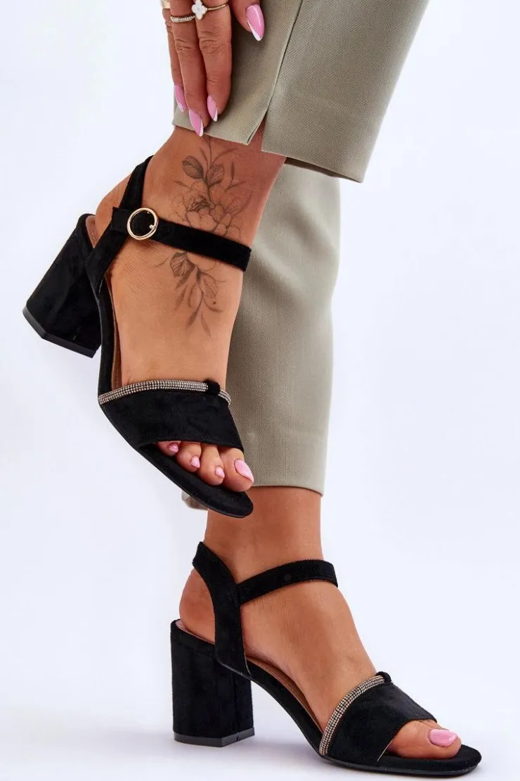 Damskie sandałki na obcasie w postaci słupka. Model ten został wykonany z miłego w dotyku eko zamszu. Sandałki zapinane na regulowany pasek ze sprzączką. Wkładka została wykonana z naturalnej skóry. Jest niezwykle miękka i wygodna w użytkowaniu. Koniecznie powinnaś je mieć! Przy wyborze rozmiaru prosimy sugerować się tabelą rozmiarów.