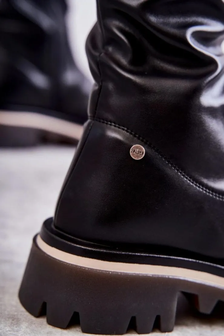 Kozaki damskie od marki GOE zostały wykonane z połączenia skóry ekologicznej i naturalnej. Model wsuwany, z dodatkowym suwakiem z boku cholewki. Buty te zostały osadzone na platformie i płaskim obcasie. Dodatkowo podeszwa jest antypoślizgowa. Kozaki zostały ocieplone miłym w dotyku kocem obuwniczym. Zapiętek jest usztywniany. Ten model to HIT tego sezonu! Przy wyborze rozmiaru prosimy sugerować się tabelą rozmiarów.