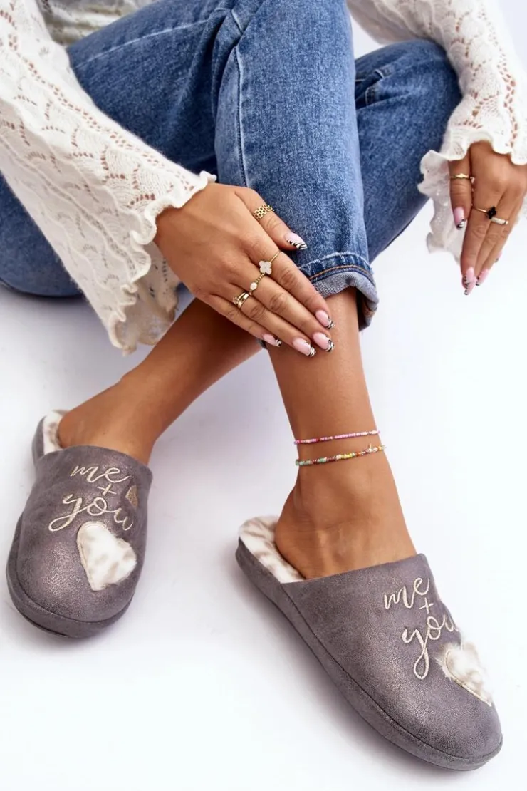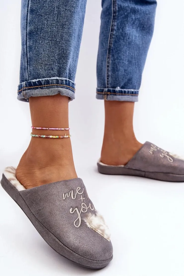 Błyszczące kapcie damskie ozdobione napisem i sercem. Model wsuwany z zakrytym noskiem. Osadzone na grubej podeszwie. Wkładka ocieplona futerkiem. Przy wyborze rozmiaru prosimy kierować tabelą rozmiarów.