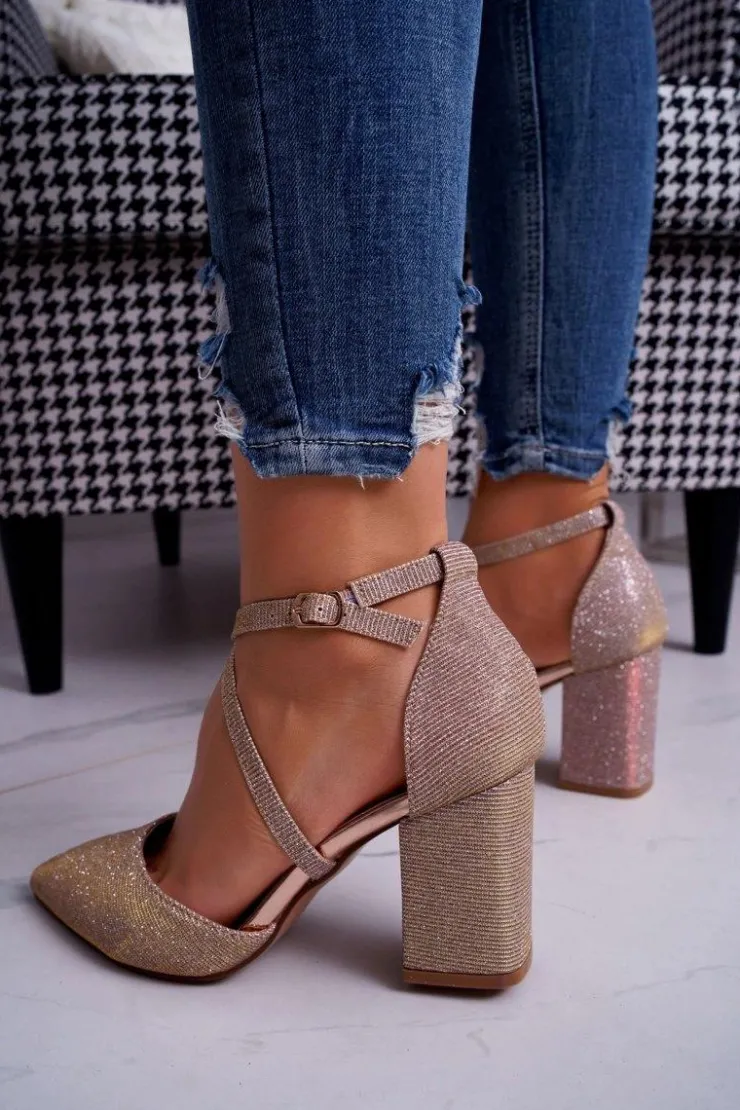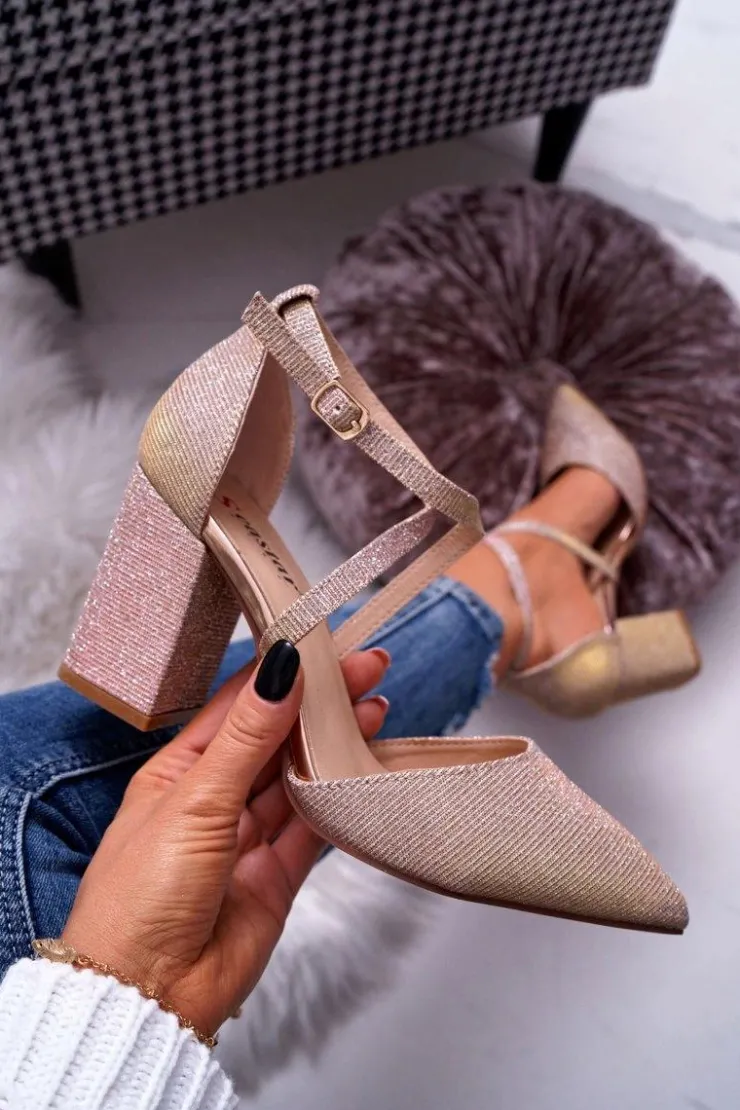 Wspaniałe czółenka na słupku, które idealnie wpasują się w nasze wieczorowe stylizacje. Brokatowy pyłek nadaje im niesamowitego uroku. Delikatny słupek oraz zapinanie wokół kostki z możliwością regulacji. Postaw na elegancki styl i wybierz te cudowne czółenka. Przy wyborze rozmiaru prosimy sugerować się tabelą rozmiarów.