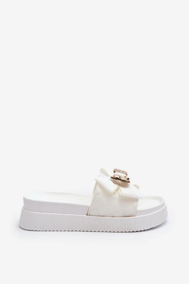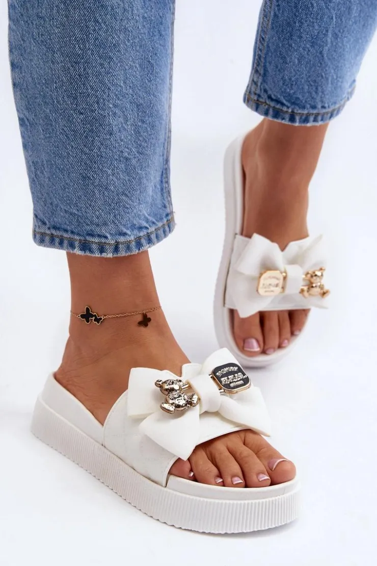 Damskie klapki wykonane z eko skóry. Osadzone na masywnej platformie. Model ten posiada materiałową kokardę i imitację agrafki z misiem i blaszką z napisem. Idealne klapki na nadchodzący sezon! Koniecznie powinnaś je mieć! Przy wyborze rozmiaru prosimy sugerować się tabelą rozmiarów.