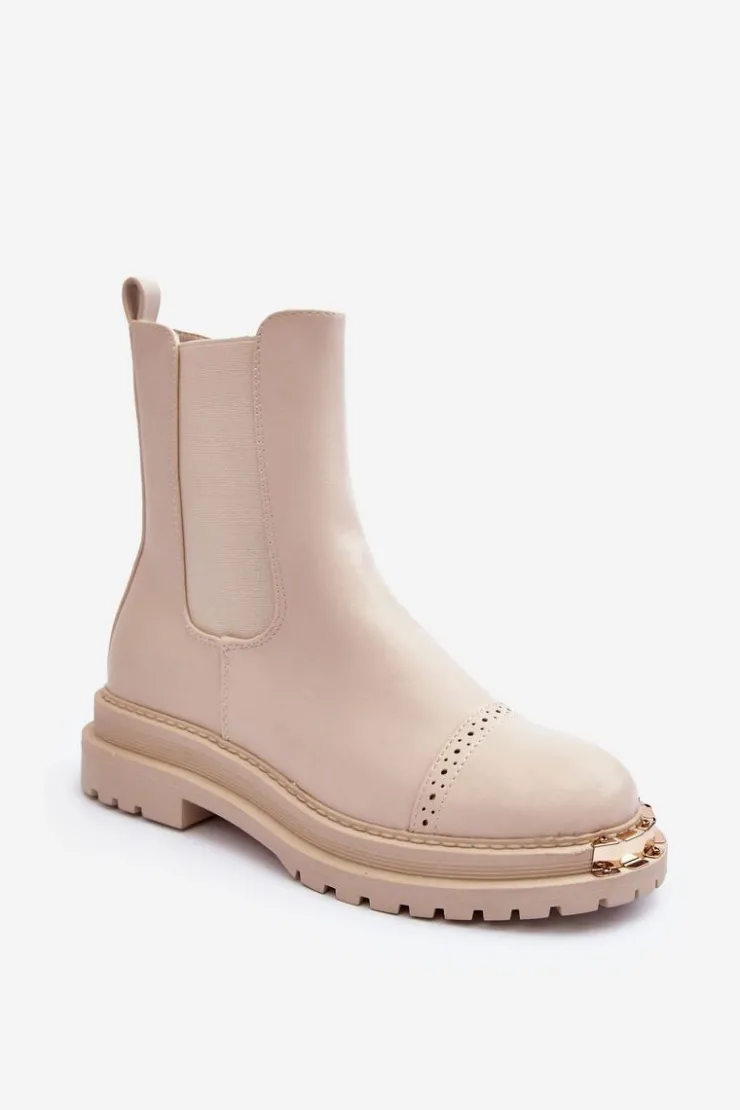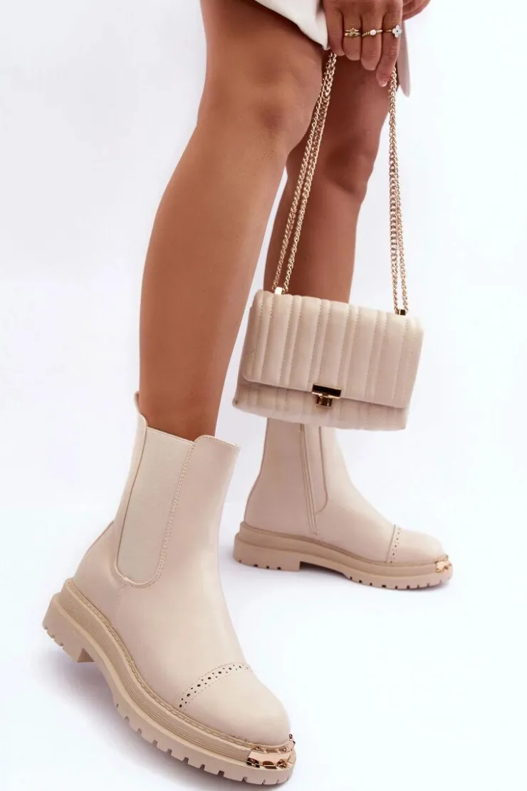 Damskie sztyblety zostały wykonane z eko skóry. Zapinane na suwak po wewnętrznej stronie cholewki. Osadzone na płaskim obcasie i platformie. Z przodu złota ozdoba z tworzywa sztucznego. Noski zaokrąglone. Ten model powinien znaleźć się w Twojej szafie! Przy wyborze rozmiaru prosimy sugerować się tabelą rozmiarów.