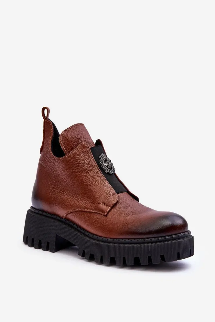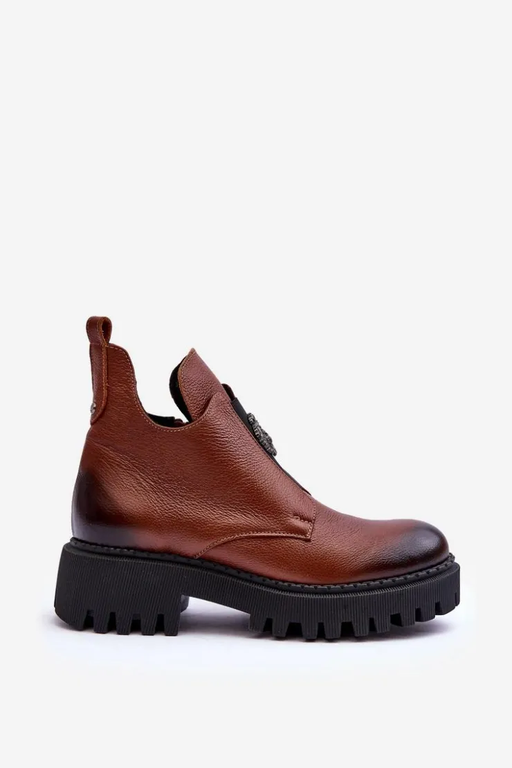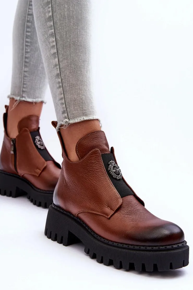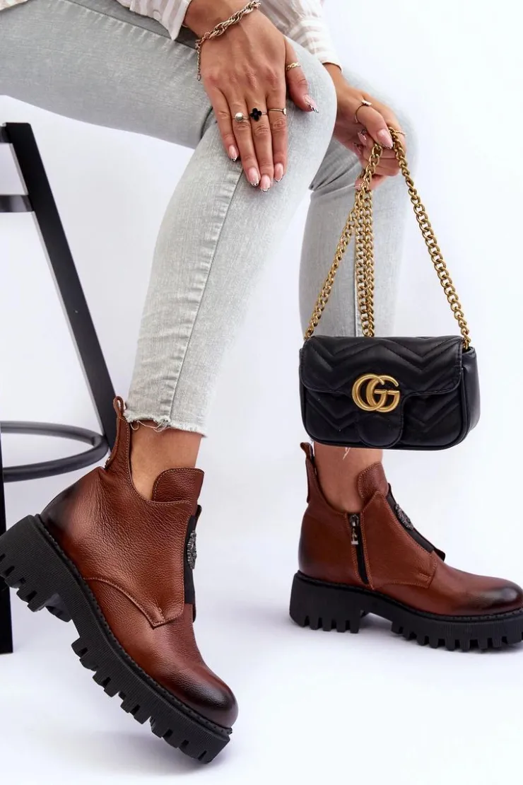 Damskie botki zostały wykonane z wysokiej jakości naturalnej skóry. Osadzone na masywnym obcasie i platformie ze żłobieniami. Model zapinany na suwak po wewnętrznej stronie cholewki. Z przodu na elastycznej wstawce znajduje się ozdoba z tworzywa sztucznego. Wnętrze ocieplone kocem obuwniczym. Ten wyjątkowy model wzbogaci wiele Twoich stylizacji! Przy wyborze rozmiaru prosimy sugerować się tabelą rozmiarów.