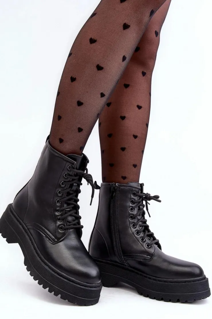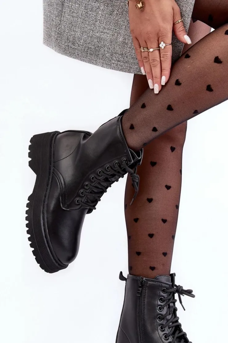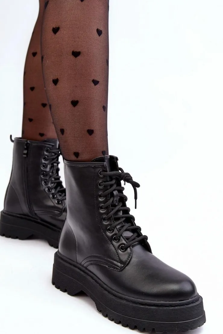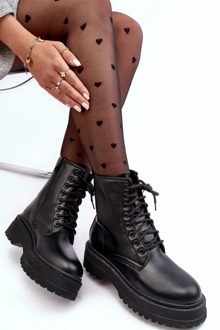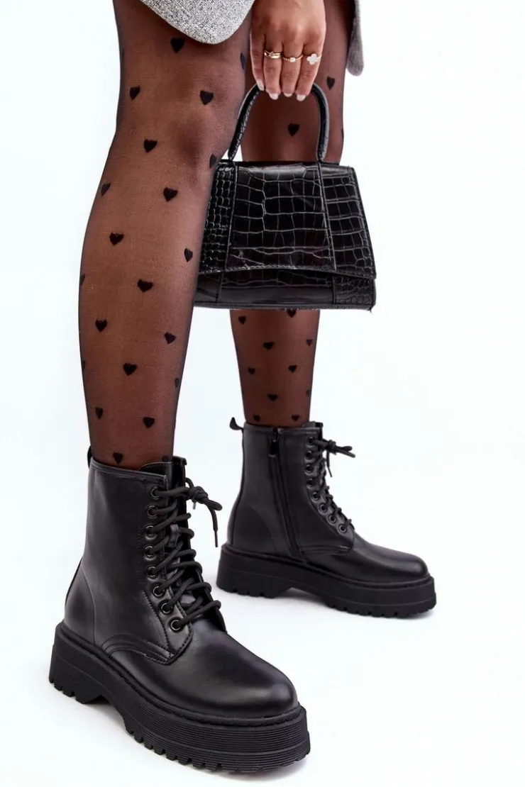 Hot Boto Damskie Sznurowane Botki Workery Na Grubej Podeszwie Czarne Biancis