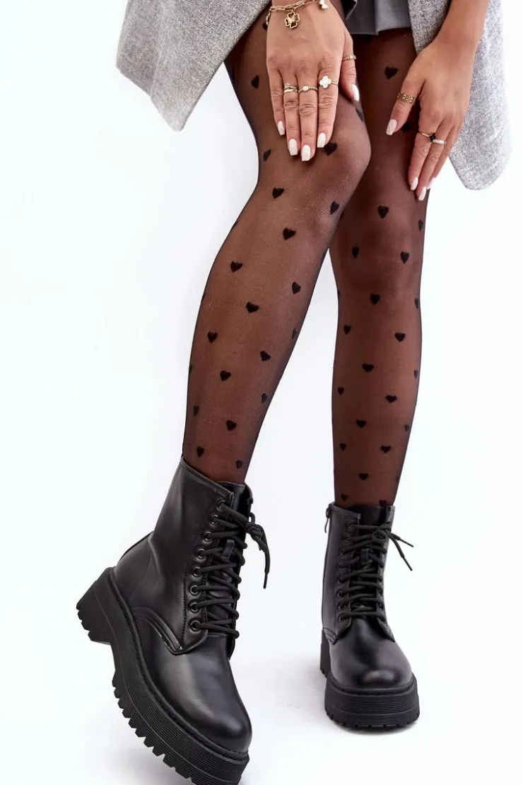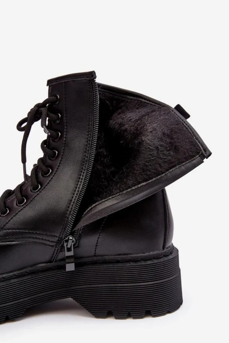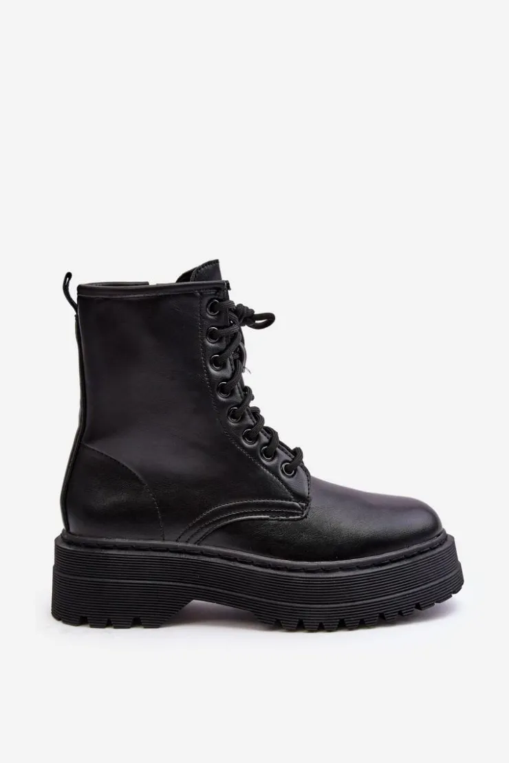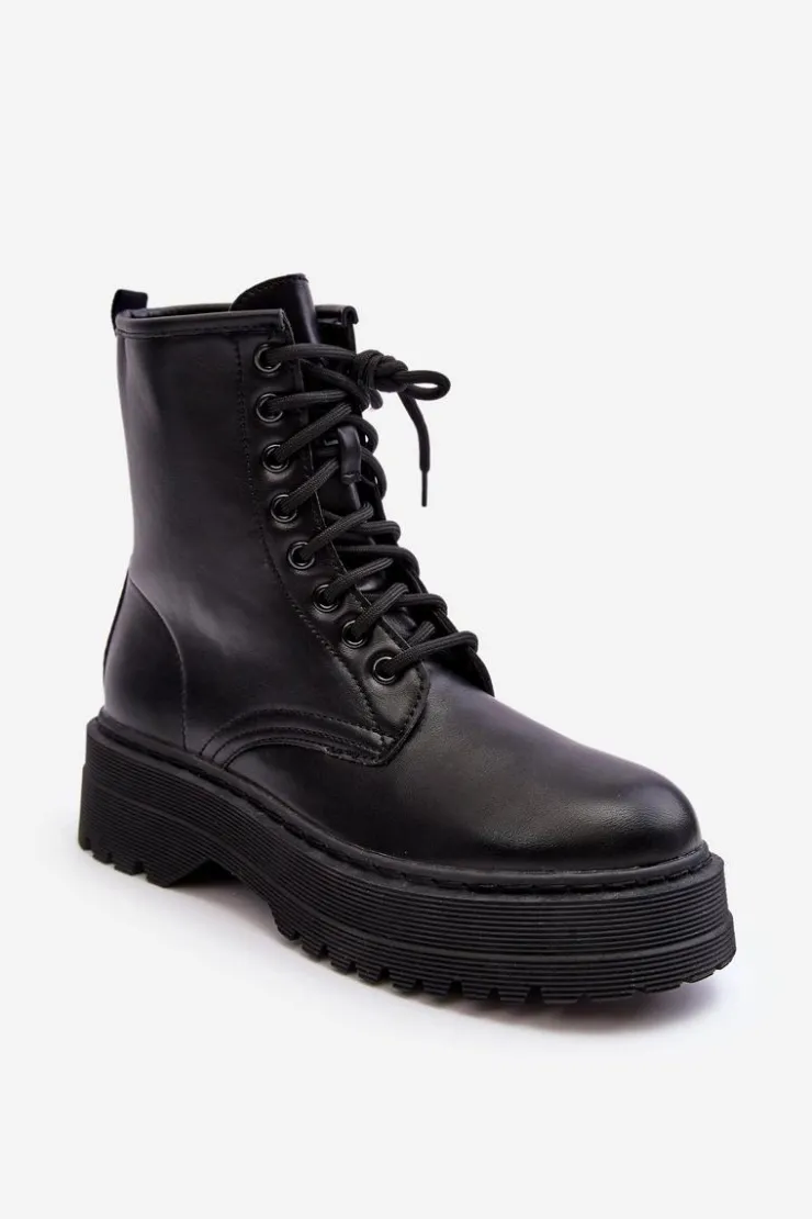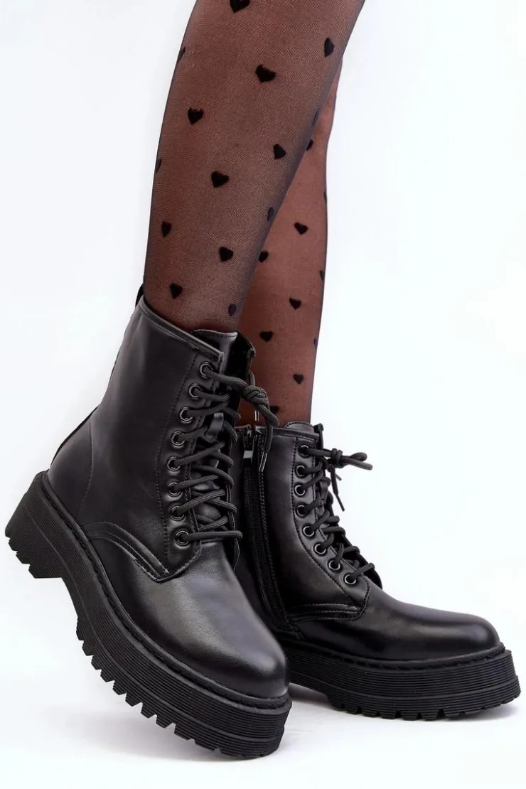 Hot Boto Damskie Sznurowane Botki Workery Na Grubej Podeszwie Czarne Biancis